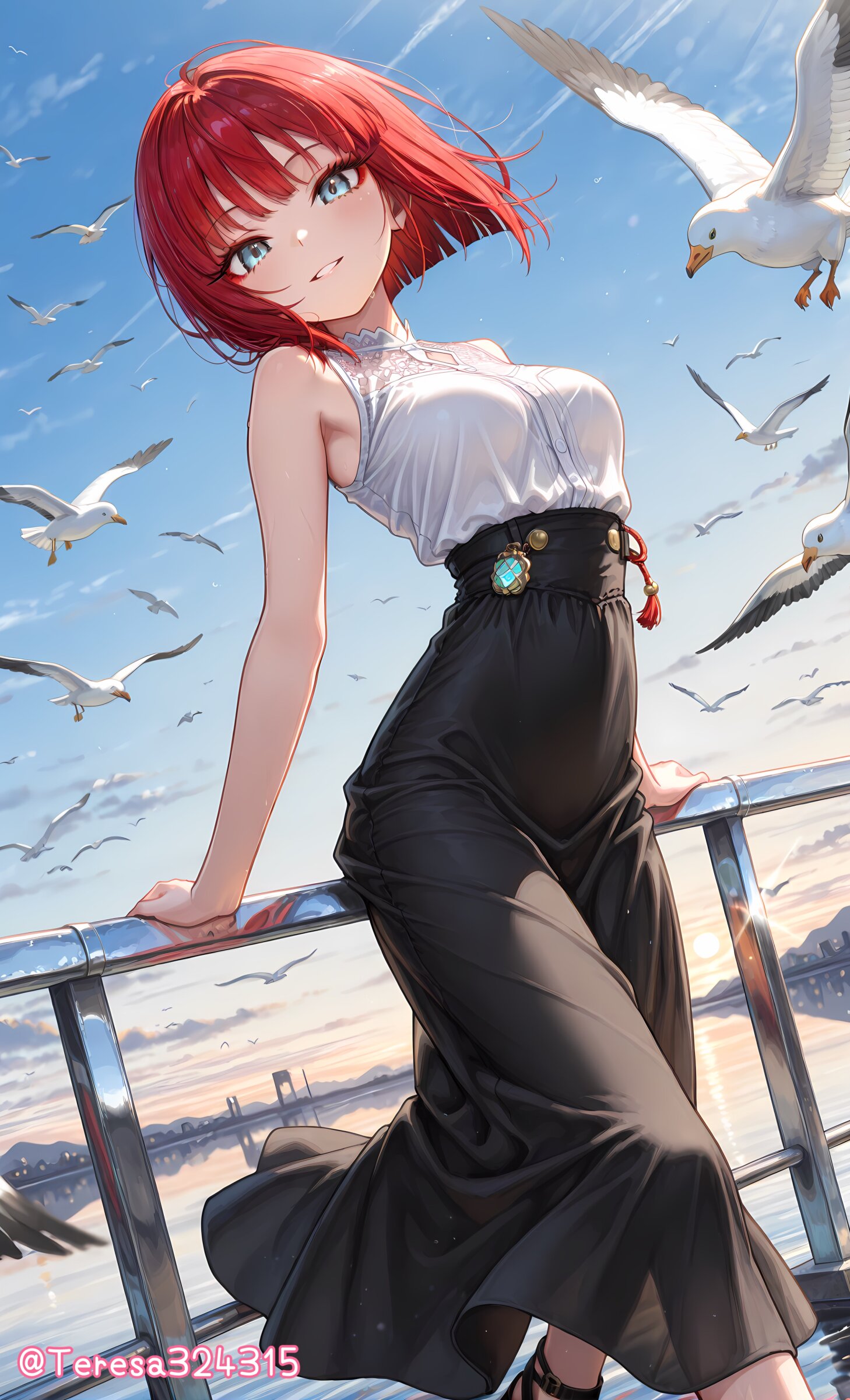 鮮やかな紅髪が淡い朝焼け空に映えます✨