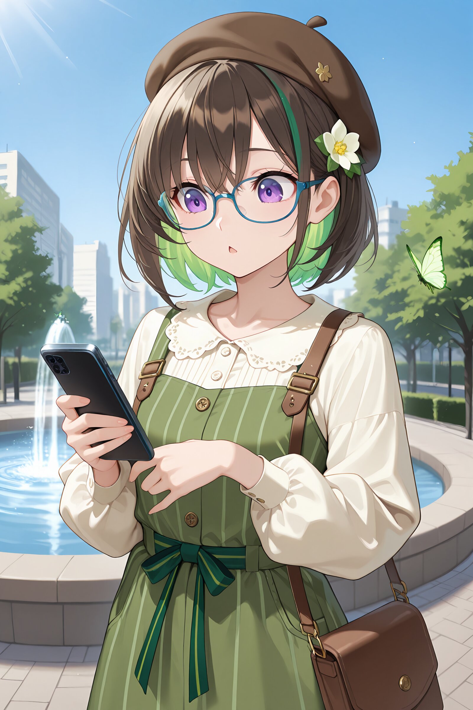 masterpiece,best quality,ultra detailed,anime style,full color,6.5 head-to-body ratio,slim body, female,adult woman,solo,(shorthair,brown hair:1.3),(green streaked hair:1.5),(hair detail:1.2),purple eyes,facial detail, (glossy hair:1.3), (bangs bangs:1.2),hair between eyes:1.1,(small breasts:1.2),(green striped bangs:1.1),(hair_flower:1.2),(details of glasses:1.1),blue-framed_eyewear,(green hair:1.2),green bangs,(emerald color inner hair color:1.2),thin green ribbon at the neck,<lora:TestProject2-10:0.4>,Zasuko_V4_XL, wearing glasses with blue rims,and a stylish spring outfit: a cream blouse with puffed sleeves,a khaki-green corduroy suspender dress with a gathered waist and decorative buttons,holding a smartphone while checking the time,standing in front of a large water fountain in a city park,clear blue sky,daytime,detailed lighting and soft shadows,vibrant colors,full body,looking slightly to the side,not directly at viewer,natural pose,overalls,brown beret,looking_at_screen,looking_down,closed mouth,chestnut mouth,sunlight,(roadside flowers:1.2),butterfly,flower snow,long_shot,from_above,cinematic_angle,