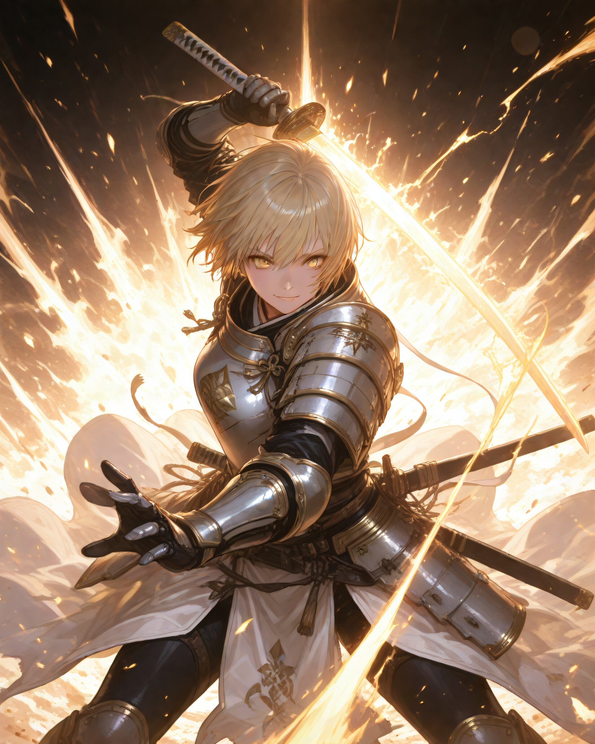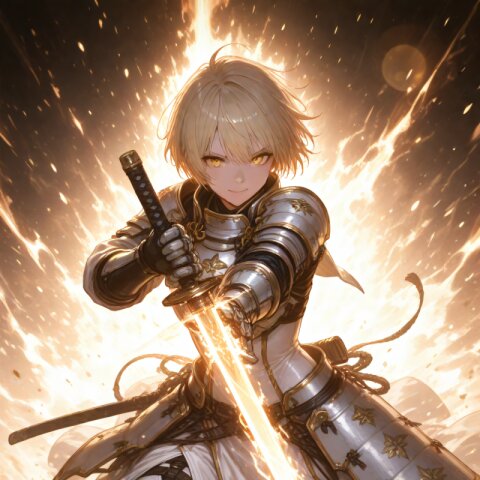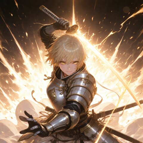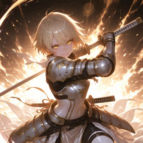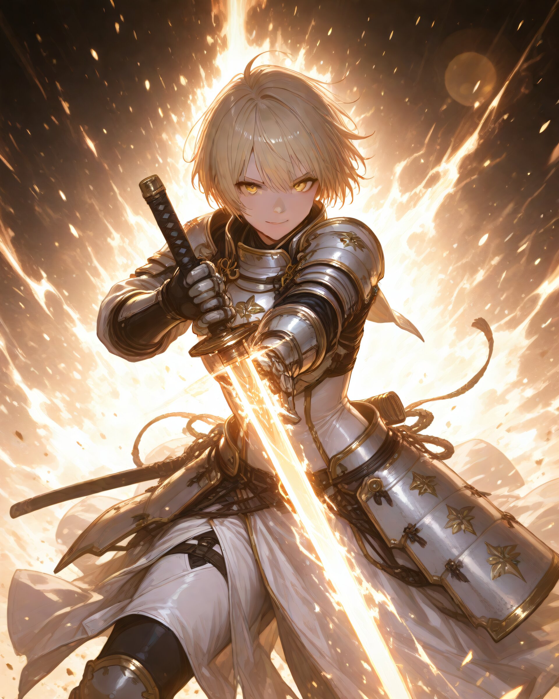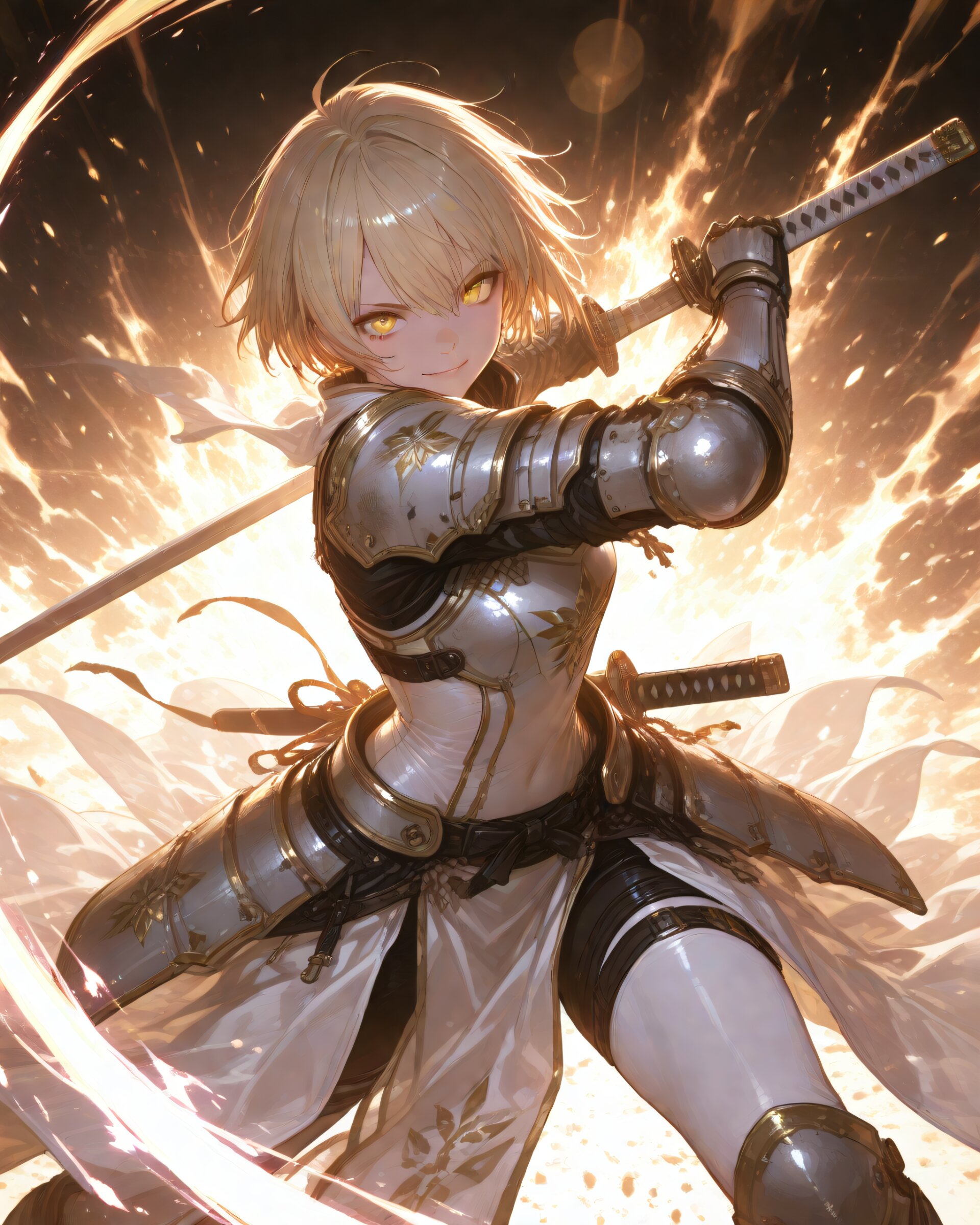 <lora:hyper_sdxl_8_step_lora_f16:1>,, a wavy blonde short haired female Japanese swordmaster, gauntlets, beautiful smile, aggressive fighting pose, lens flare, sword, luminous dress armor, magic aura, glowing, neon aura, high contrast, BREAK masterpiece, amazing quality, best quality, very aesthetic, ultra-detailed, 8K, newest, vivid,dramatic lighting,