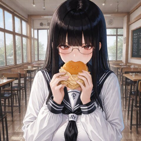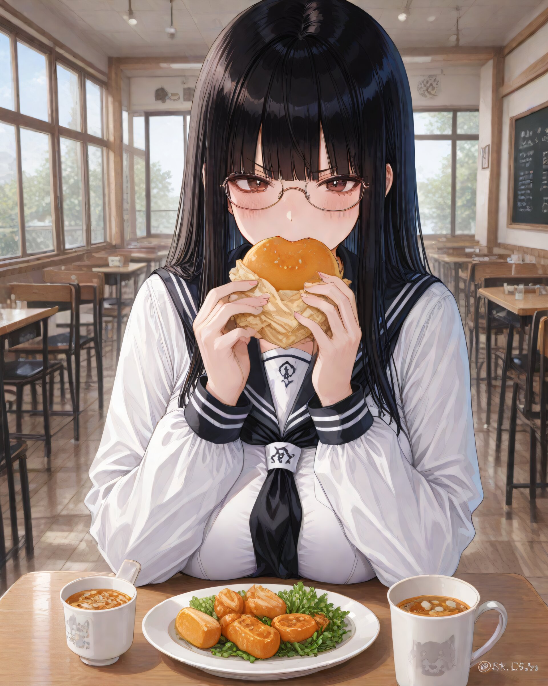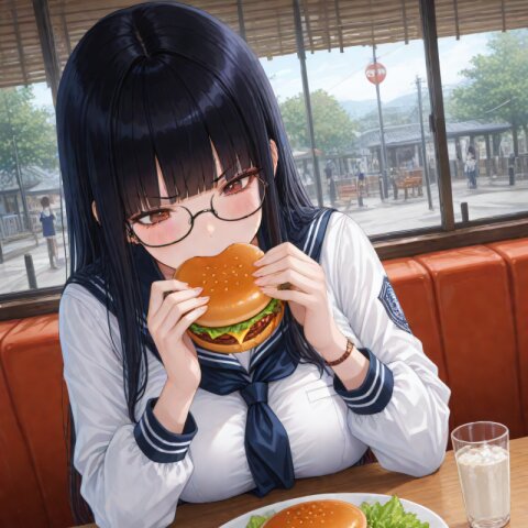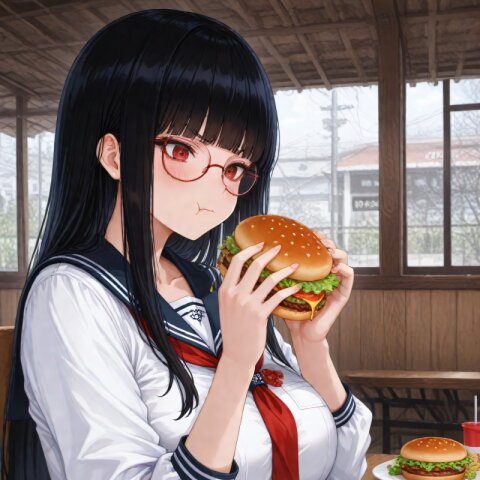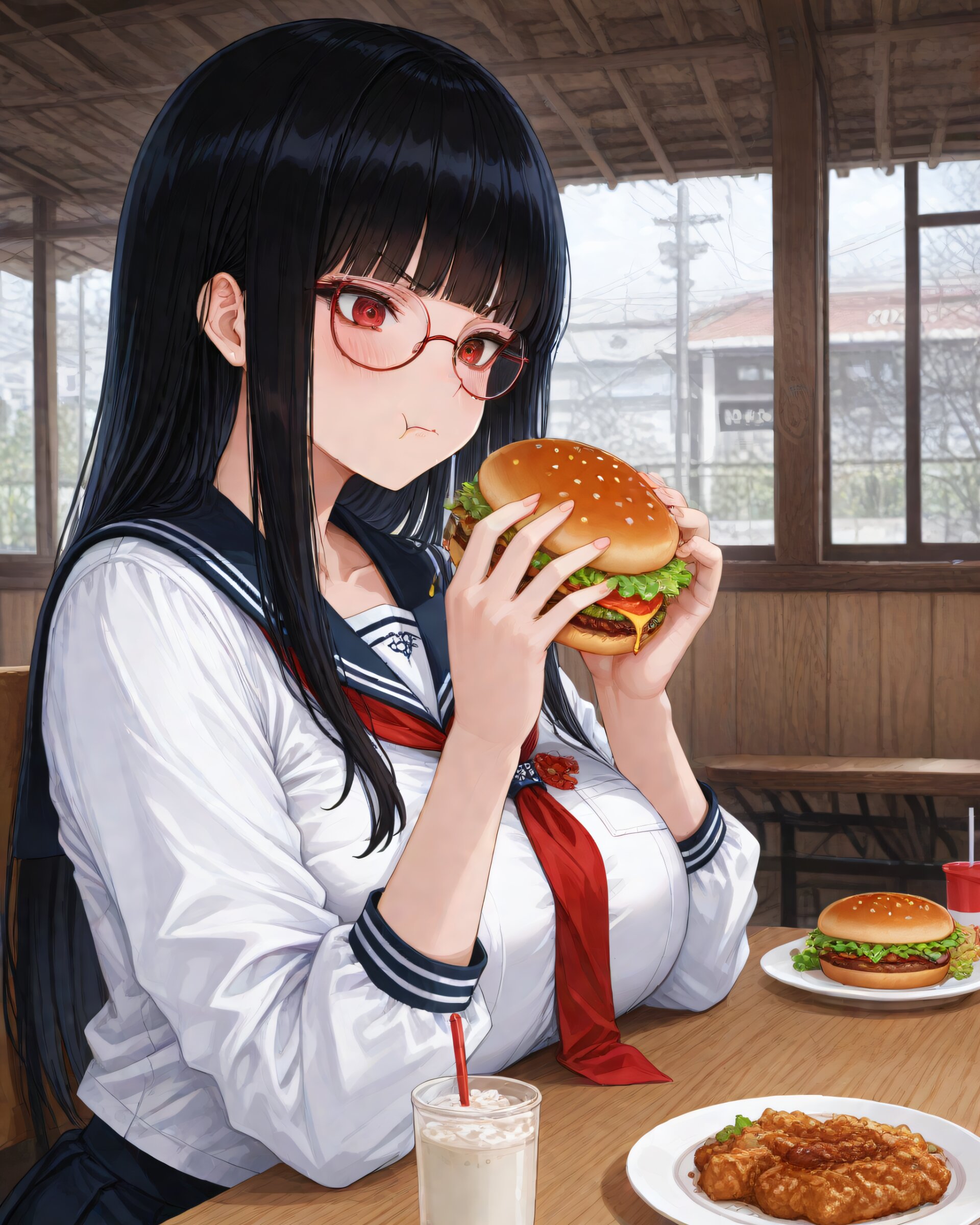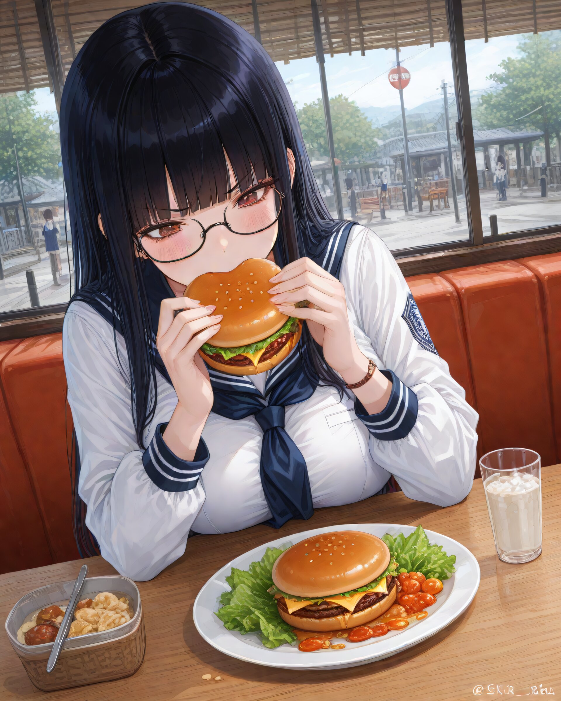 <lora:hyper_sdxl_8_step_lora_f16:1>,, 1girl, eating, lunch, plate, hamburger, restaurant, day, BREAK 18 years old, girl, long straight black hair, blunt bangs, large breasts, school uniform, se-ra Fuku, glasses, blush, angry, BREAK masterpiece, amazing quality, best quality, ultra-detailed, 8K, newest, Japanese, vivid color,