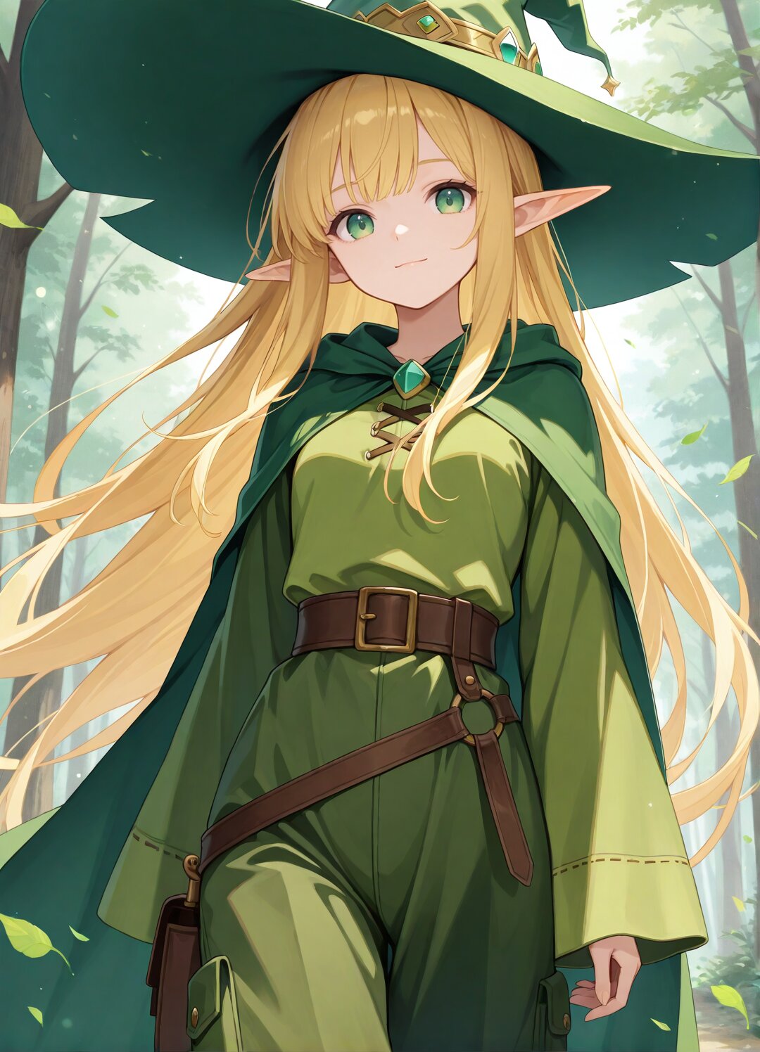 masterpiece,best quality,highres,highly detailed,detailed eyes,general,1girl,solo,17yo,(elf ears,pointy ears,(green witch's hat,blond hair, very long hair,bangs, green eyes)),cute girl,slender,small breasts,Very long sleeves that cover wrists,light smile,closed mouth,(very long witch's green robe,very long witch's green cape,very long witch's green cloak,very long green cargo pants),green obi,slender girl,walking,cowboy shot,looking at viewer,in green forest,Green leaves falling in the wind,fantasy,