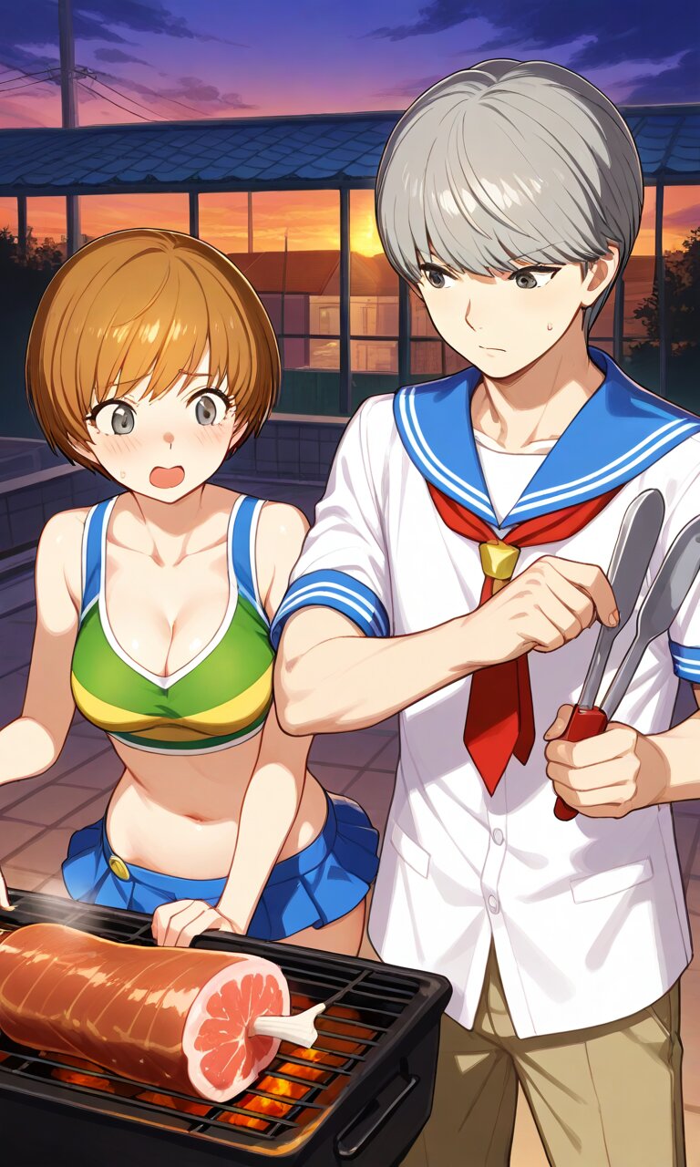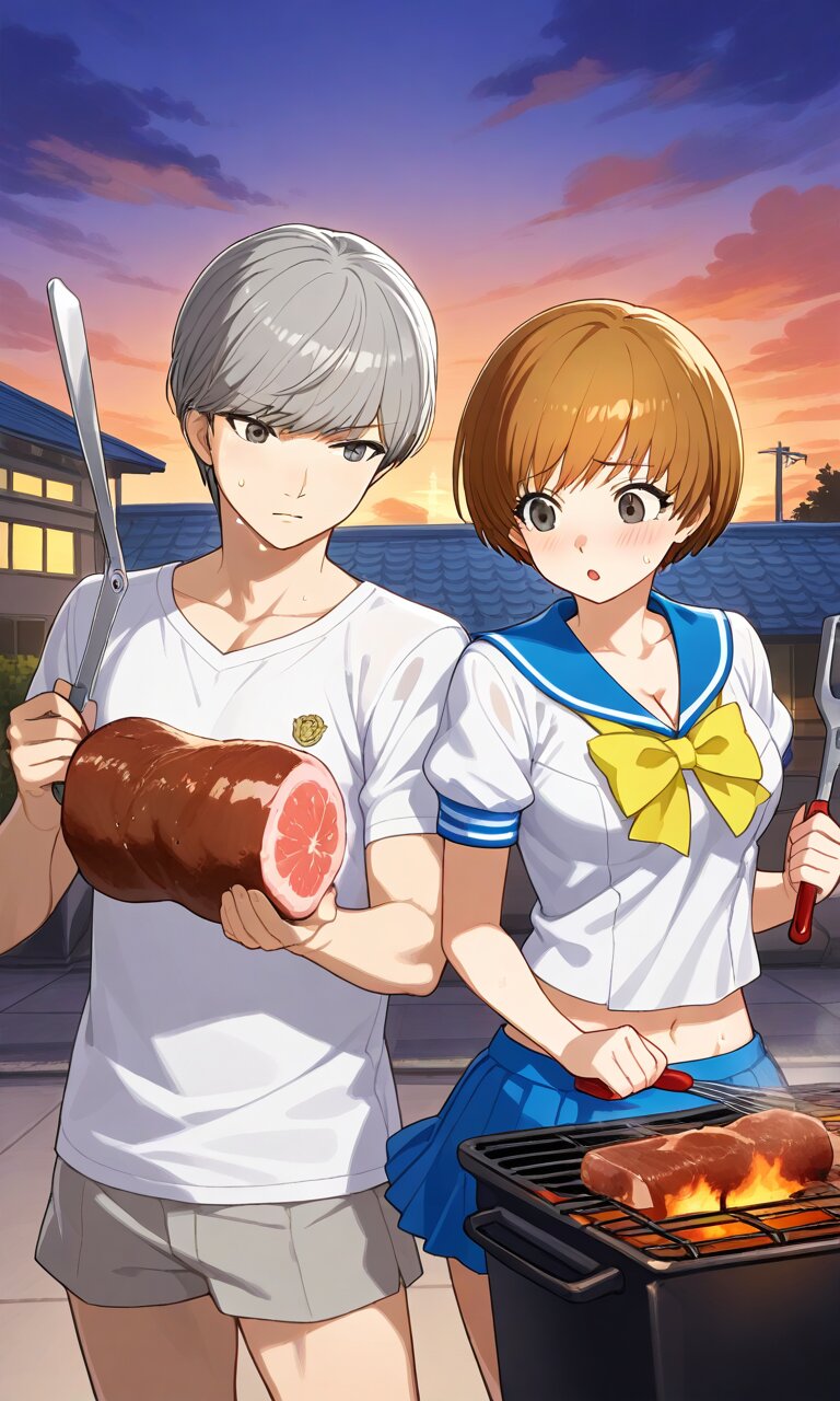 Couple, boy and girl, two people only,absurdres, ultra-detailed, master piece, high resolution, 8k, Boy, girl, couple,School rooftop, barbecue festival, evening, huge meat grilling, big barbecue stove BREAK Boy, in school uniform, grilling huge meat, sweat, eager expression, tongs BREKA Girl, sailor suit, cleavage, navel, mini skirt, cheering for boy BREAK the boy(narukami yu, grey hair, grey eyes,) BREAK the girl(satonaka_chie),