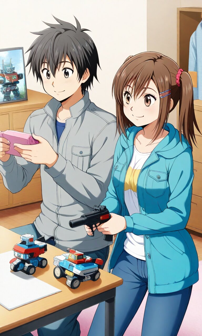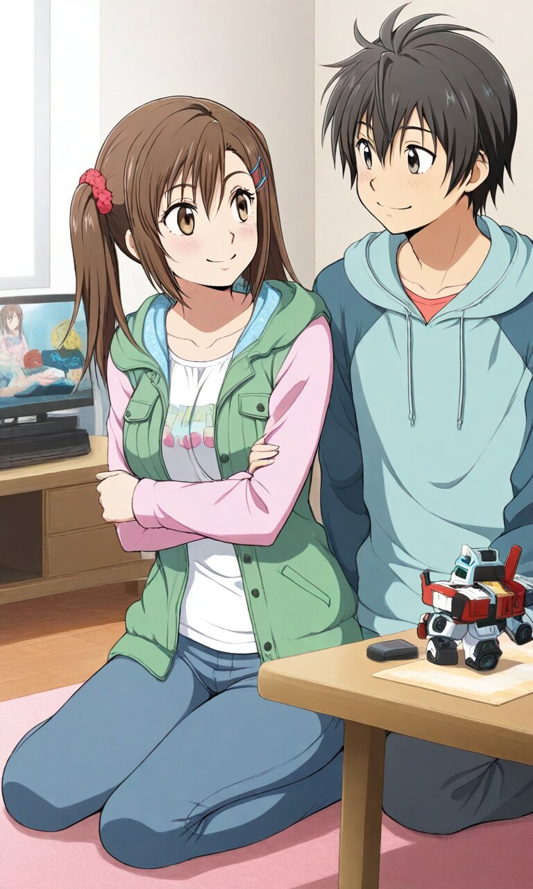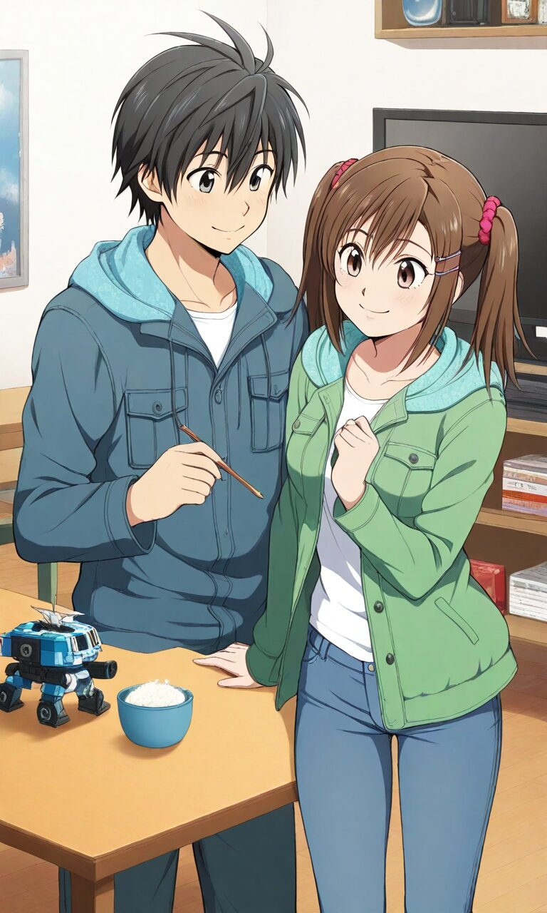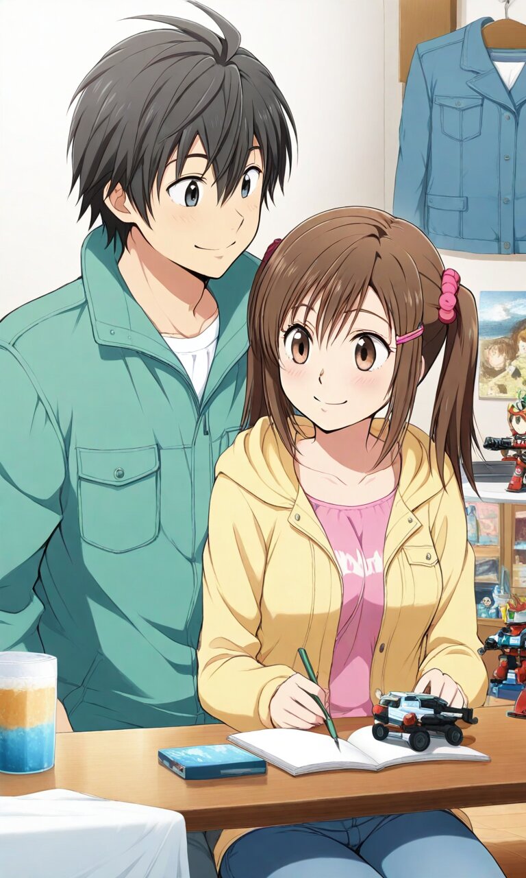 Couple, boy and girl, two people only,absurdres, ultra-detailed, master piece, high resolution, 8k, Boy, girl, couple,My room, making Gunpla, table, nippers, finished Gunpla BREAK Boy, long sleeved jacket, jeans, smiling BREAK Girl, smiling, showing Gunpla to the boy BREAK the boy(original boy,black hair,black eyes) BREAK the girl(MISA3,1girl,brown hair,brown eyes,hair ornamen,twintails,),,