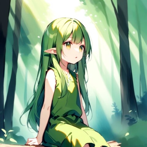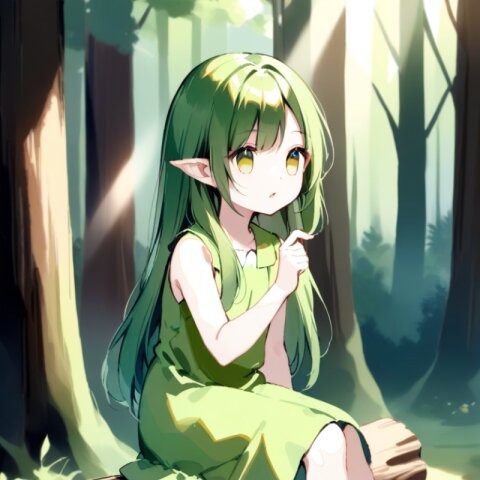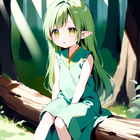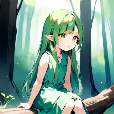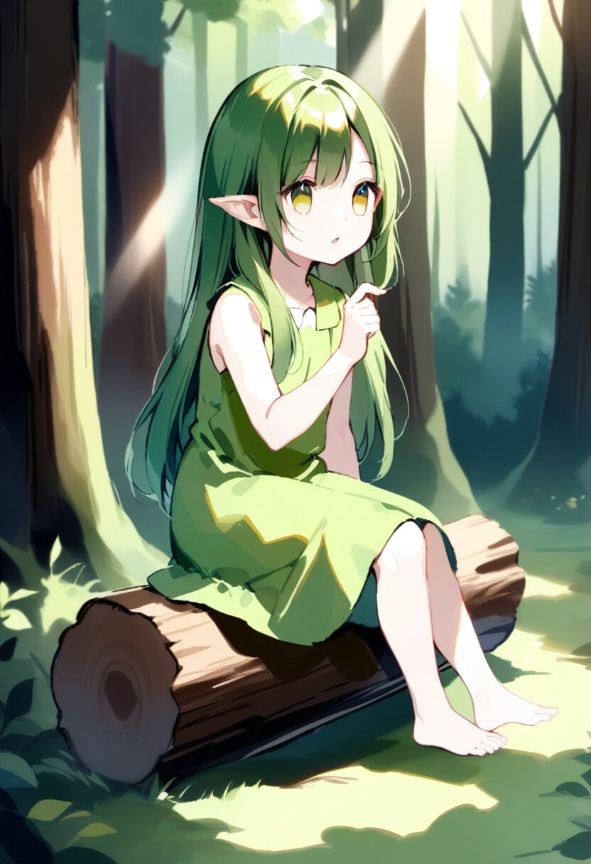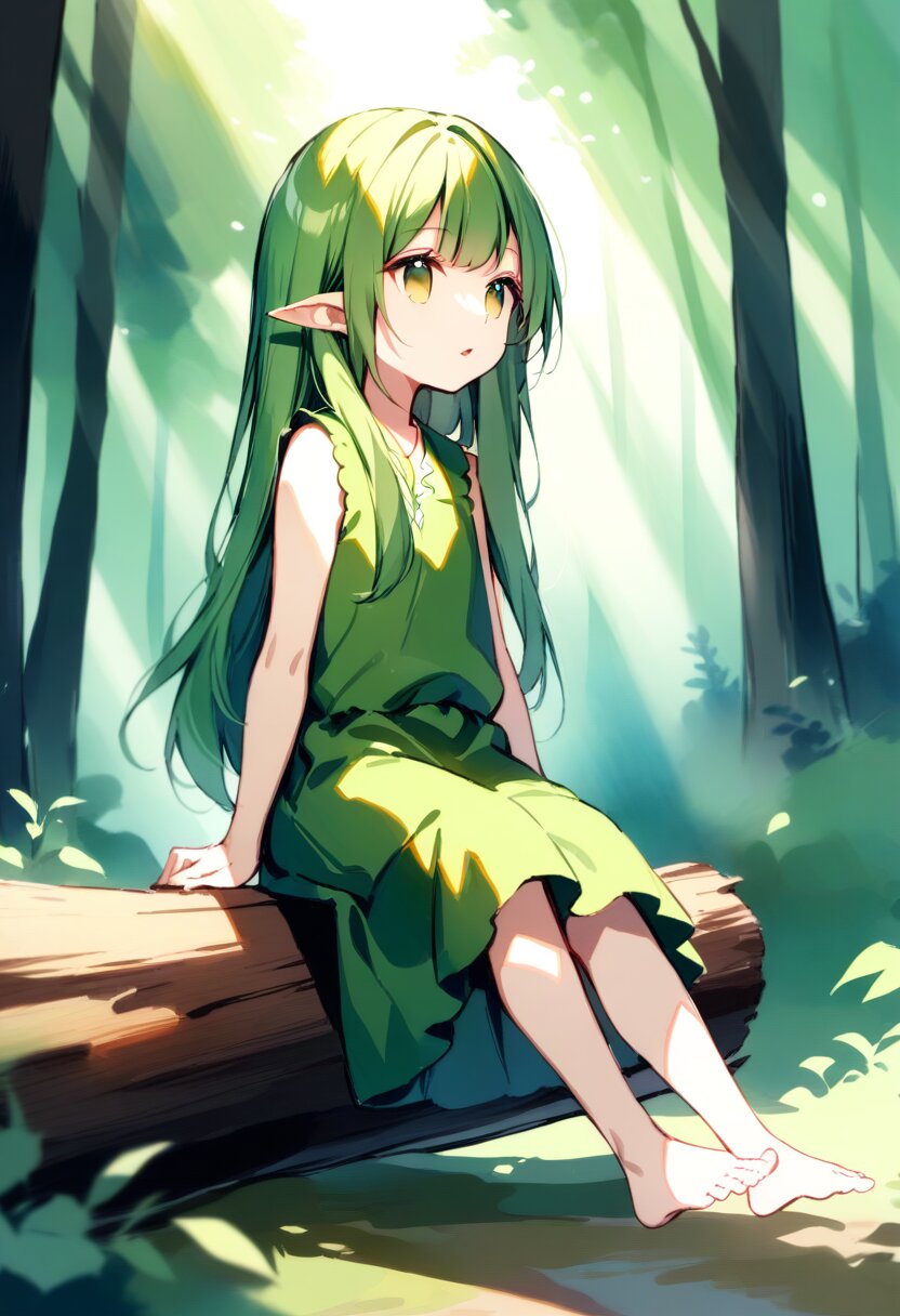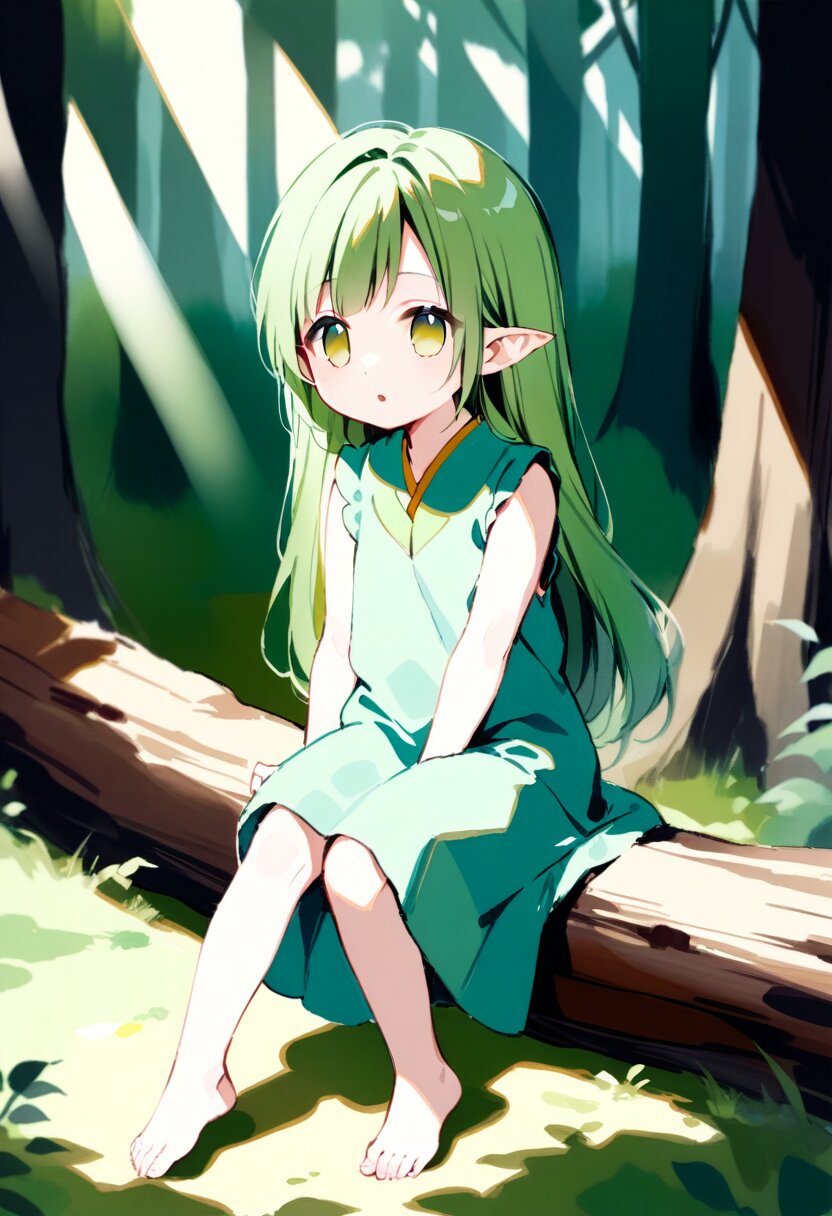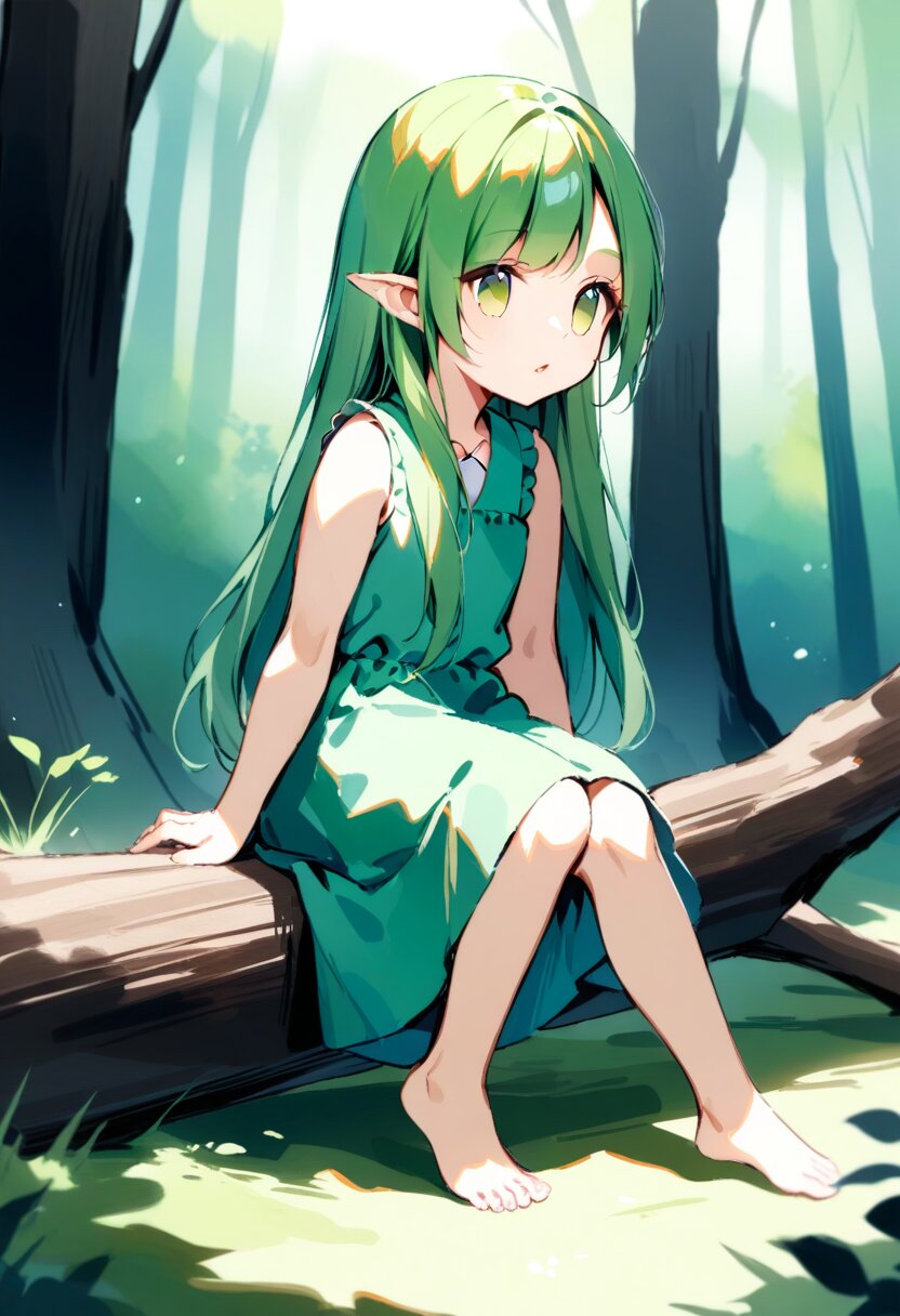 <lora:inmnstylexl:1> <lora:yumekawaii_ftr:1>best quality, masterpiece, very aesthetic, general, watercolor painting, 1girl, 10 years old, green hair, long hair, green eyes, pointy ears, parted lips, green dress, sleeveless, barefoot, sitting on log, forest, sunlight