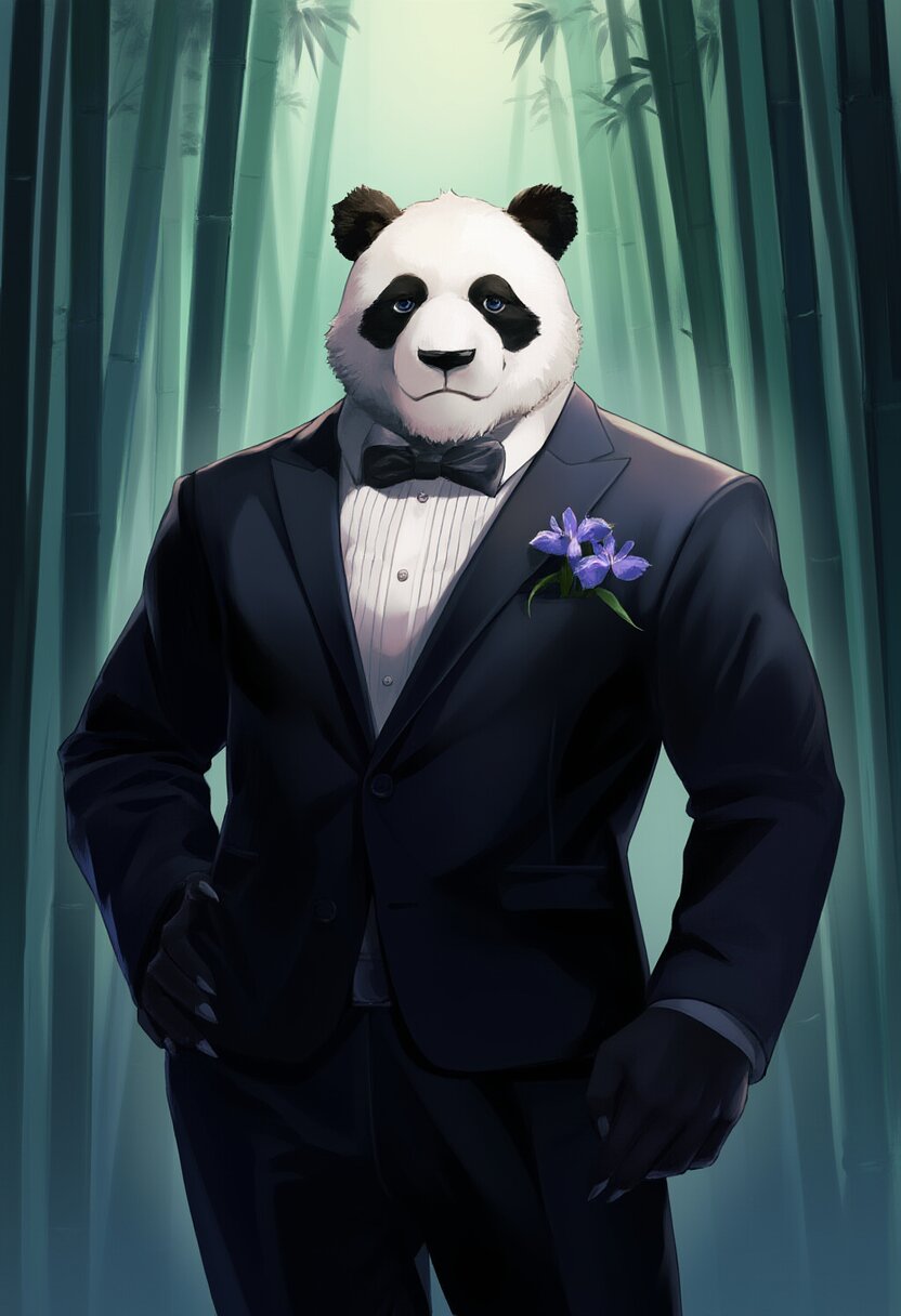 (traditional media:1.5),(sepia:1.8),masterpiece,best quality,ultra detailed,{{{panda}}},muscular,tuxedo,serious,looking at viewer,hand on hip,Bamboo Forest,Iris flowers,green theme,, rating:general, best quality, very aesthetic, absurdres