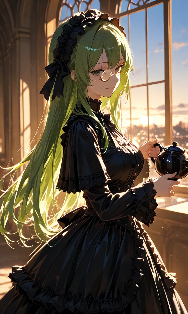 1 lady, long hair, green hair,((monocle)), (gothic lolita, black cloth),, ,seductive smile, cowboy shot, evening,standing, (holding tea pot), side view,