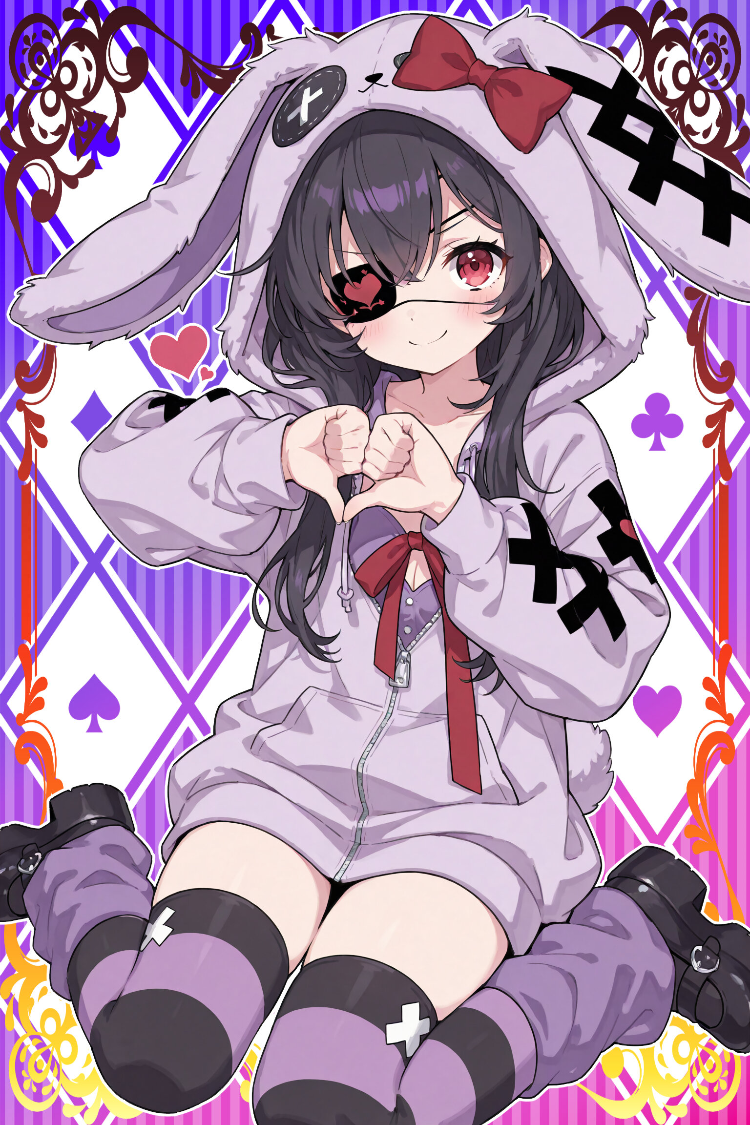 pastel color, (flat color:0.2), masterpiece, best quality, great, depth of field, fine detail, ultra-detailed, thumbs down, thumbs down heart hands, wariza, blush, smile, black hair, red eyes, (yamikawa style rabbit kigurumi hoodie), oversized pastel purple and black rabbit-themed kigurumi, pastel purple pullover hoodie with relaxed silhouette, (fluffy pastel purple faux fur texture), long floppy bunny ears with (black cross stitch decoration), big black ribbon bow on one ear, hood with bunny face motif, fake animal eyes made of buttons on hood, (put on hood, hood covers head, voluminous hood silhouette), (black eyepatch with red heart-shaped embroidery) on one eye, loose pastel purple bodice with black broken heart symbol on chest, long sleeves with extra large cuffs, pastel purple and black striped leg warmers, (striped pattern thigh-high stockings with red ribbon decoration), black platform shoes, 5fingers and 1thumb, <lora:sdxl2-flat2-512b:0.2><lora:sdxl-eye_turime:-1><lora:viola:0.5>