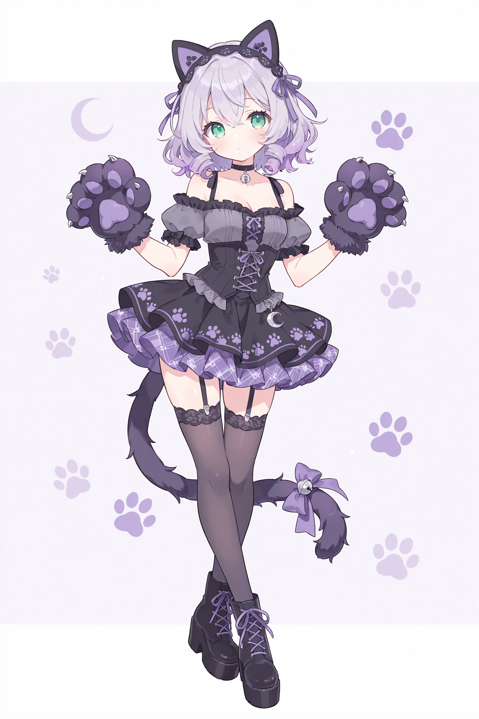 pastel color, (flat color:0.2), masterpiece, best quality, great, depth of field, fine detail, ultra-detailed, midnight black and violet idol costume with cat motif, (black cat ear headband with violet ribbon), sweetheart neckline, off-shoulder, short puff sleeves with shimmering violet trim, bare arms, fitted bodice with (violet corset lace-up), shiny black and violet two-tone mini dress, layered frilly skirt with cat paw pattern lining, flared mini skirt, A-line silhouette, (black choker with silver bell), (black tail accessory with ribbon bow), (black thigh-high stockings with violet paw print pattern), black stockings, black platform ankle boots with silver buckle, silver mic with crescent moon charm, (black fluffy mitten gloves with purple paws), large black fluffy paw gloves, <lora:sdxl2-flat2-512b:0.2><lora:sdxl-eye_turime:-1><lora:viola:0.5>