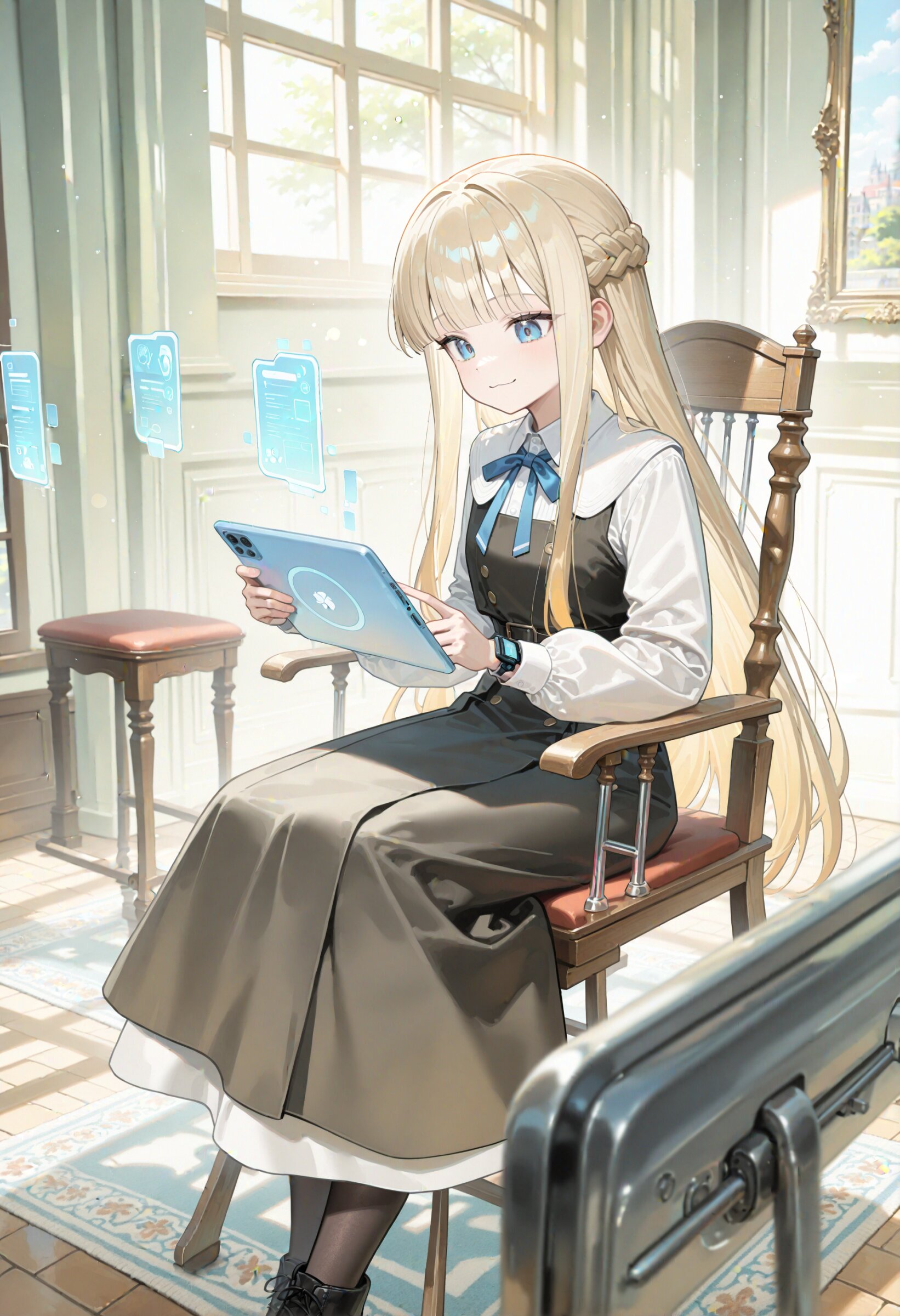 from side (character focus:1.2), knees out of frame from below, looking down (black Pinafore dress in beige fur-trimmed coat, blue neck ribbon, white blouse, 4gold buttons, 1girl (13yo:1.1), overly long sleeves very long hair, french braid, straight hair, hime cut, blond hair, blue eyes, closed mouth smile, :3 smile, index fingers raised:1.0), fantasy alternate tokyo \(city\), real world location, Wood panel walls, iron rack, vintage chair, amber light, brick-patterned carpet, tablet pc, floating holographic interface, smartwatch depth of field, bokeh, dramatic lighting, afternoon, super fine concept art, hard surface, 8K, unreal engine, masterpiece, best quality, amazing quality, very aesthetic, absurdres, you can add scenery, (volumetric lighting), To make the background more distinctive. professional art lots of details, , overexposure, (watercolor style:1.2), (pastel color style:1.0) <lora:noline (1):-0.5> <lora:sdxl2-flat2-512b:0.0> <lora:facelightup_xl_v10:0.5>