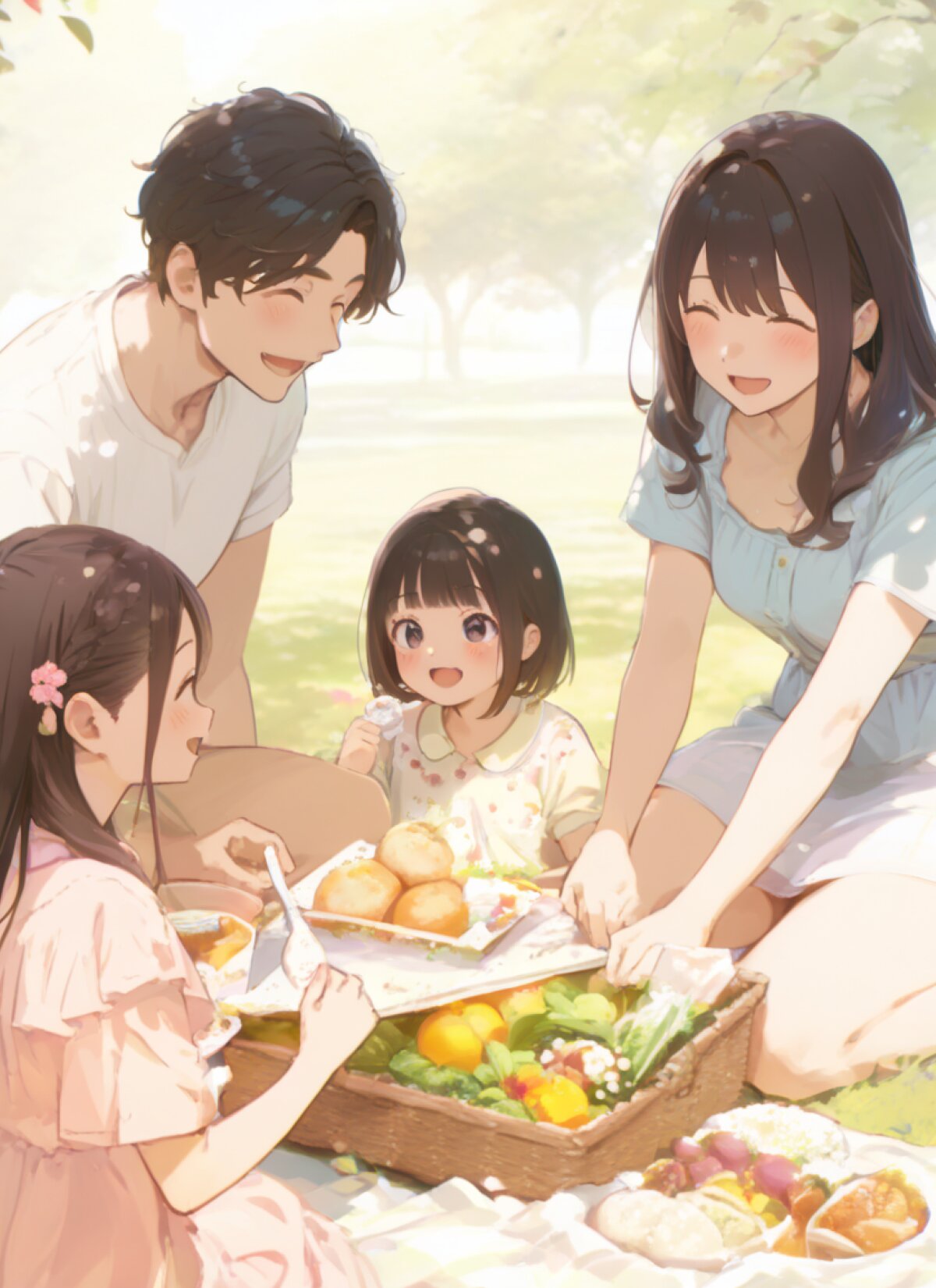 masterpiece, best quality,4 persons,family along,1 girl and 1 boy and mother and father,picnic,smile,happy,