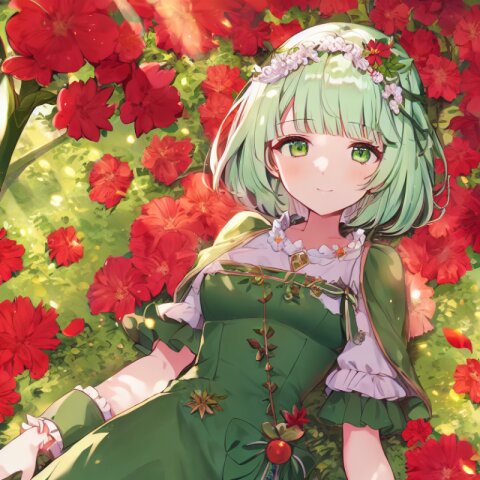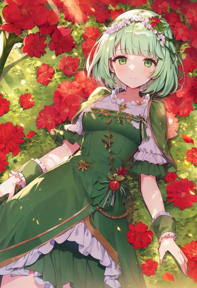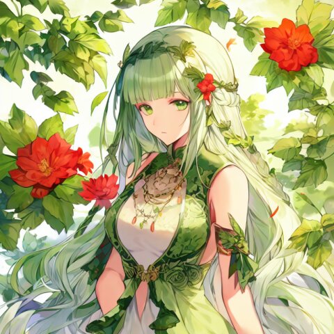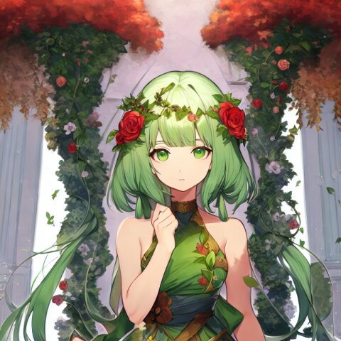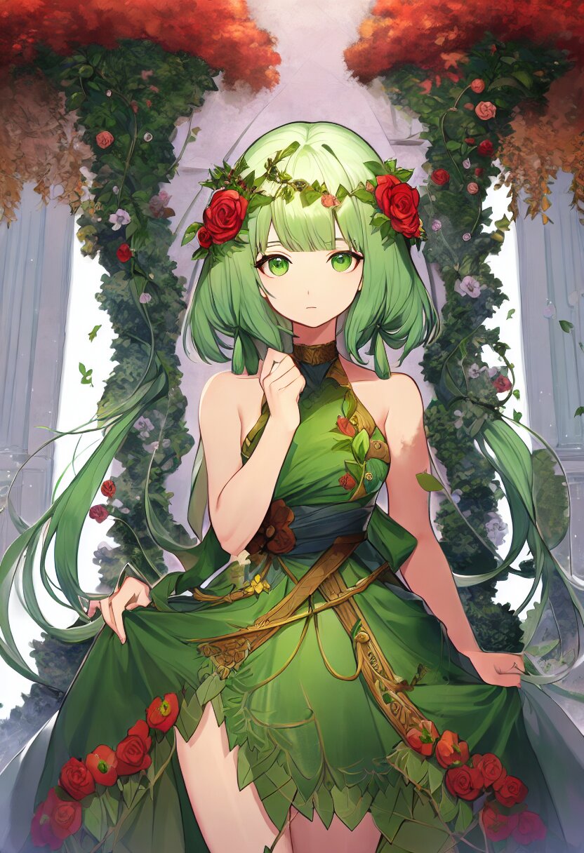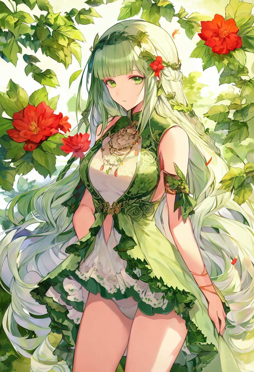 very aesthetic, best quality, absurdres, {{{hair vines}}}, {{{red flower}}}, {{{green leaves}}}, {{{girl}}}, {{{beautiful detailed light green hair}}}, {{{long bangs}}}, {{{beautiful detailed green eyes}}}}, green cloth, above the knee, forest, A lot of vines wrap around the body, vines fly in the air, with blush cheeks, official art, {{ultra-detailed}}, {{high resolution}}, dynamic fuzziness, colorful, cowboy shot, underwear, girl ,solo, 20 years old, beautiful detailed hair, beautiful detailed eyes, blunt bangs, braid hair, twintail, side ponytail, bob, Shostakovich,