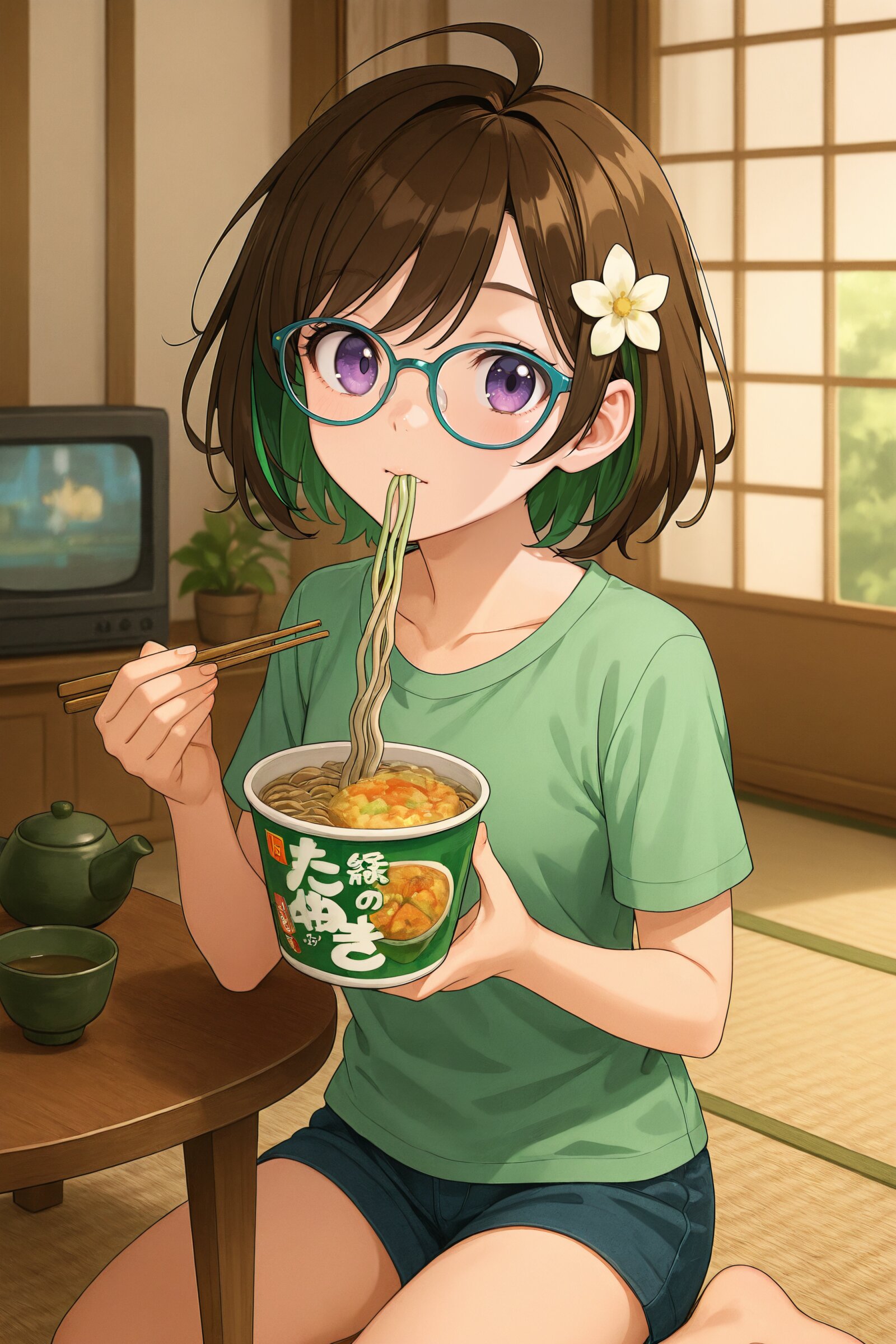 female,solo,(shorthair,brown hair:1.3),(green streaked hair:1.5),hair detail,purple eyes,facial detail, (ahoge:1.2),(glossy hair:1.3), (bangs bangs:1.2),hair between eyes:1.1,(small breasts:1.2),(hair_flower:1.2),(details of glasses:1.1),blue-framed_eyewear,green hair,(emerald color inner hair color:1.2), t-shirt,<lora:TestProject2-10:0.4>,face_focus,thin green ribbon at the neck,wide eyes,closed mouth,:>,homu,(Pouted lips:1.1),