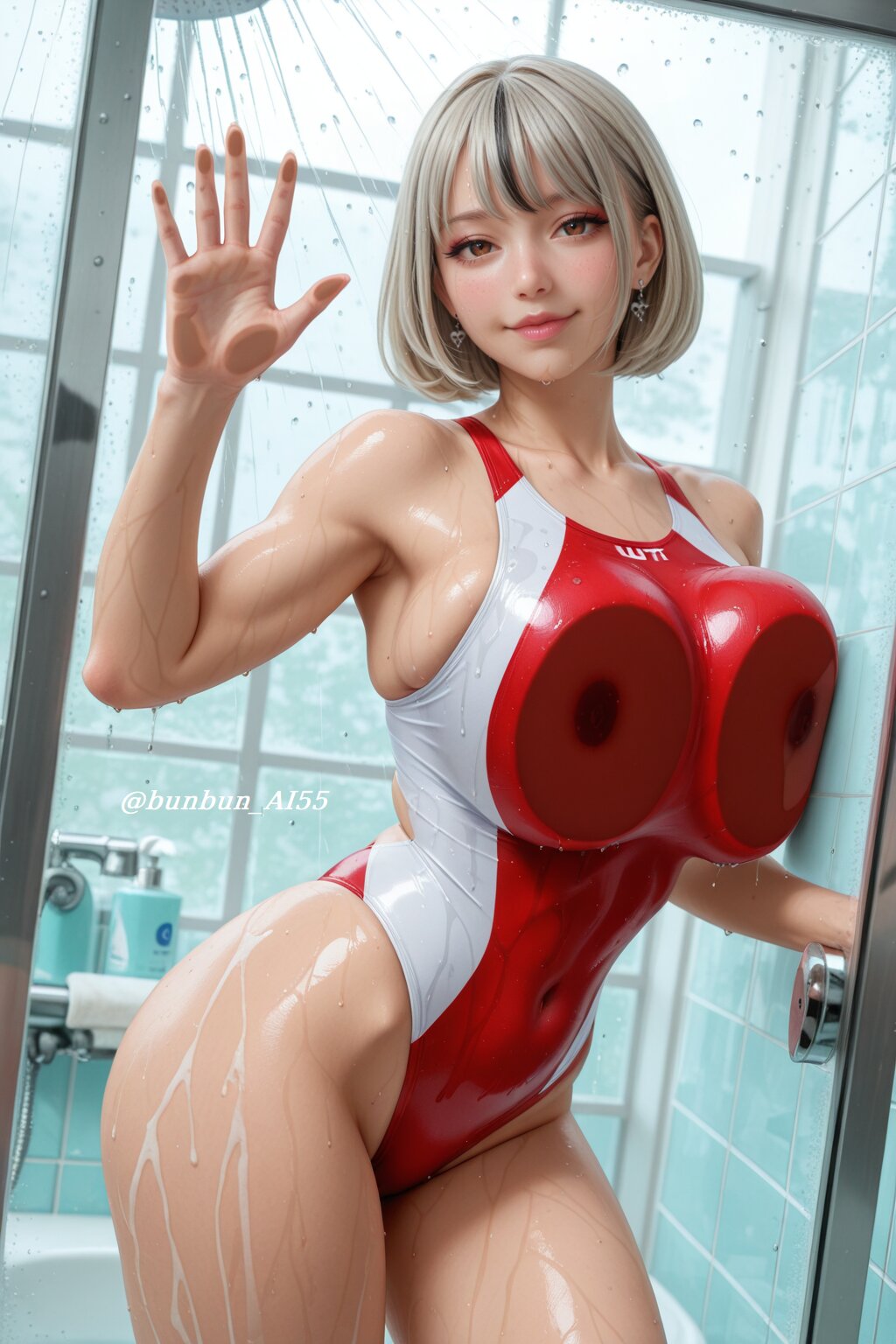 HDR, 8K,masterpiece, best quality, amazing quality, very awa, very aesthetic, absurdres, newest, detailed eyes, realistic eyes, realistic body, (realistic, hyperrealistic, photorealistic), highres, add detail, sharp detailes, sharp lines, sharp focus, real skin, no lineart, glamorous atmosphere, BREAK perfect lighting, professional lighting, (1girl, beautiful tall girl, 18year old), (kawaii, idol, jirai kei), (japanese face, slim face, small face, cute face, detailed face, brown eyes, jirai kei makeup, pink lips), (looking at viewer, seductive smile, blush), (brown and silver hair:1.5, two-tone hair, short hair), (jewelry, piercing, earrings), nsfw, (huge breasts, pointy breasts), long legs, (perfect hands), (shiny skin, glossy skin, wet skin, water droplets), (curvy body, athletic body, muscle), (wearing a ultra highleg competition swimsuit with U-neck, intricate clothing design), (red ultra highleg competition swimsuit with U-neck:1.5), (light reflections), (shiny, glossy, luster), (tight fit), (glossy texture), (standing, legs apart, dynamic pose), (against glass window:1.5, breast press:1.5), (detailed background, shower room background, wet glass window, frosted glass window, steamy atmosphere), (from side | straight-on), (bust-up shot, medium shot, dynamic angle, dutch angle),