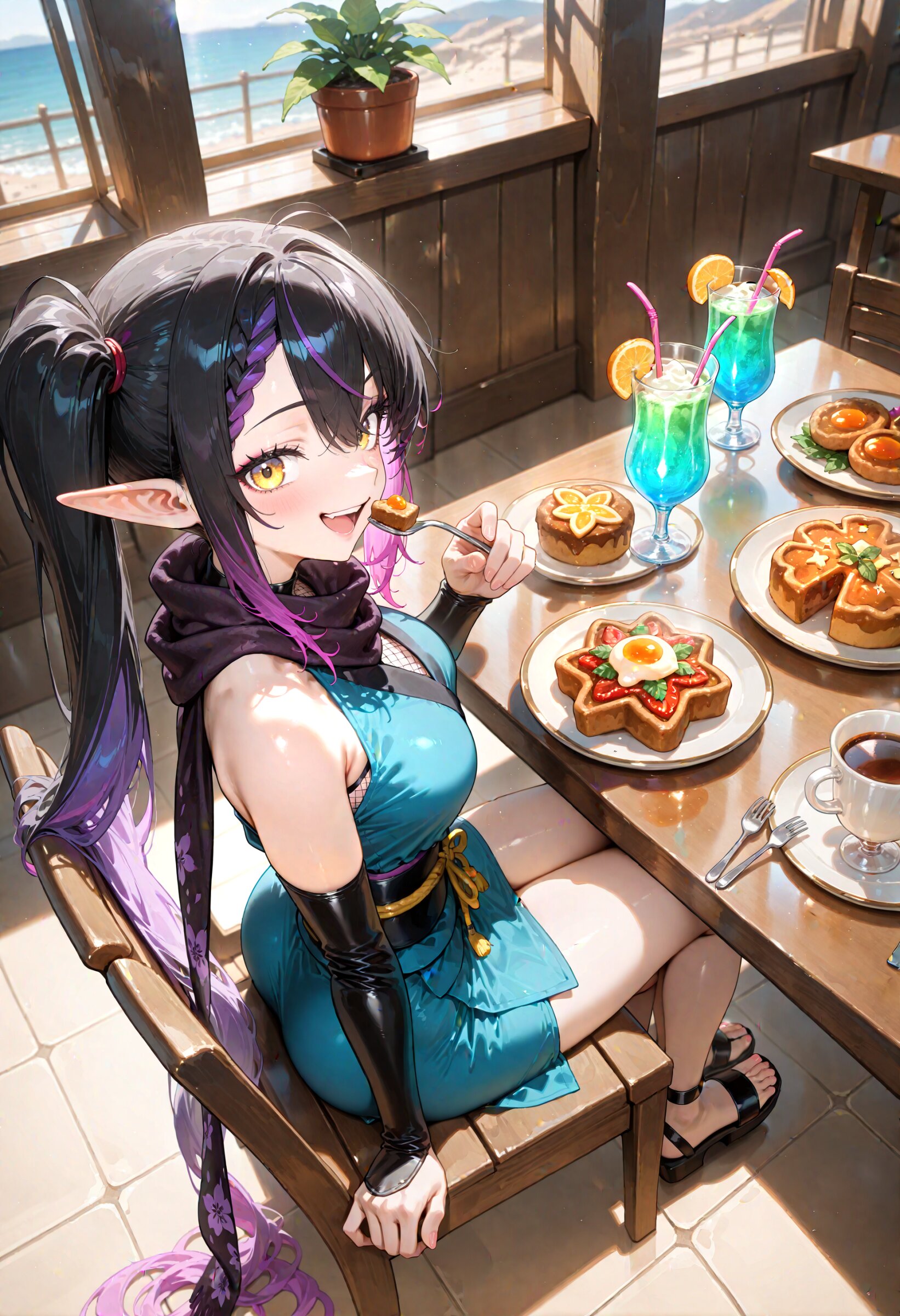 multiple girls, 2girls, (elf girls:1.2), , having a drinking party at a restaurant. (The restaurant's rooftop terrace offers breathtaking panoramic views of the medieval fantasy town:1.0). They are seated around a round table, drinking, chatting, and enjoying their food. Please show their joyous expressions and the sense of camaraderie between them, (noon:1.0), soft natural sunlight, (wide shot:1.1), from side, looking back, from above, dutch angle, , perfect anatomy, with fork ,spoon, , eating summer vegetable risotto on plate, pork gingerbread on plate, , egg tart on plate, professional anime art lots of details, , overexposure, shiny-glistening, (watercolor style:1.2), (pastel color style:0.8) you can add scenery, (volumetric lighting), To make the background more distinctive. super fine concept art, hard surface, 8K, unreal engine, masterpiece, best quality, amazing quality, very aesthetic, absurdres, newest, ambient occlusion, raytracing, <lora:noline (1):-0.5> <lora:sdxl2-flat2-512b:0.15> <lora:facelightup_xl_v10:0.5>