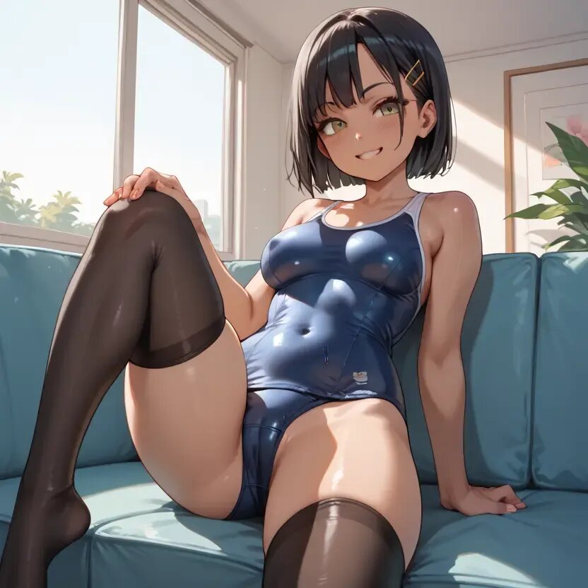 school_swimsuit,old_school_swimsuit,shiny_clothes,thighhighs,seductive_smile,in summer,indoor,couch,1girl,mesugaki,early teen,loli,tan,slender,black hair,short hair,medium breasts,narrow_waist,giggling,