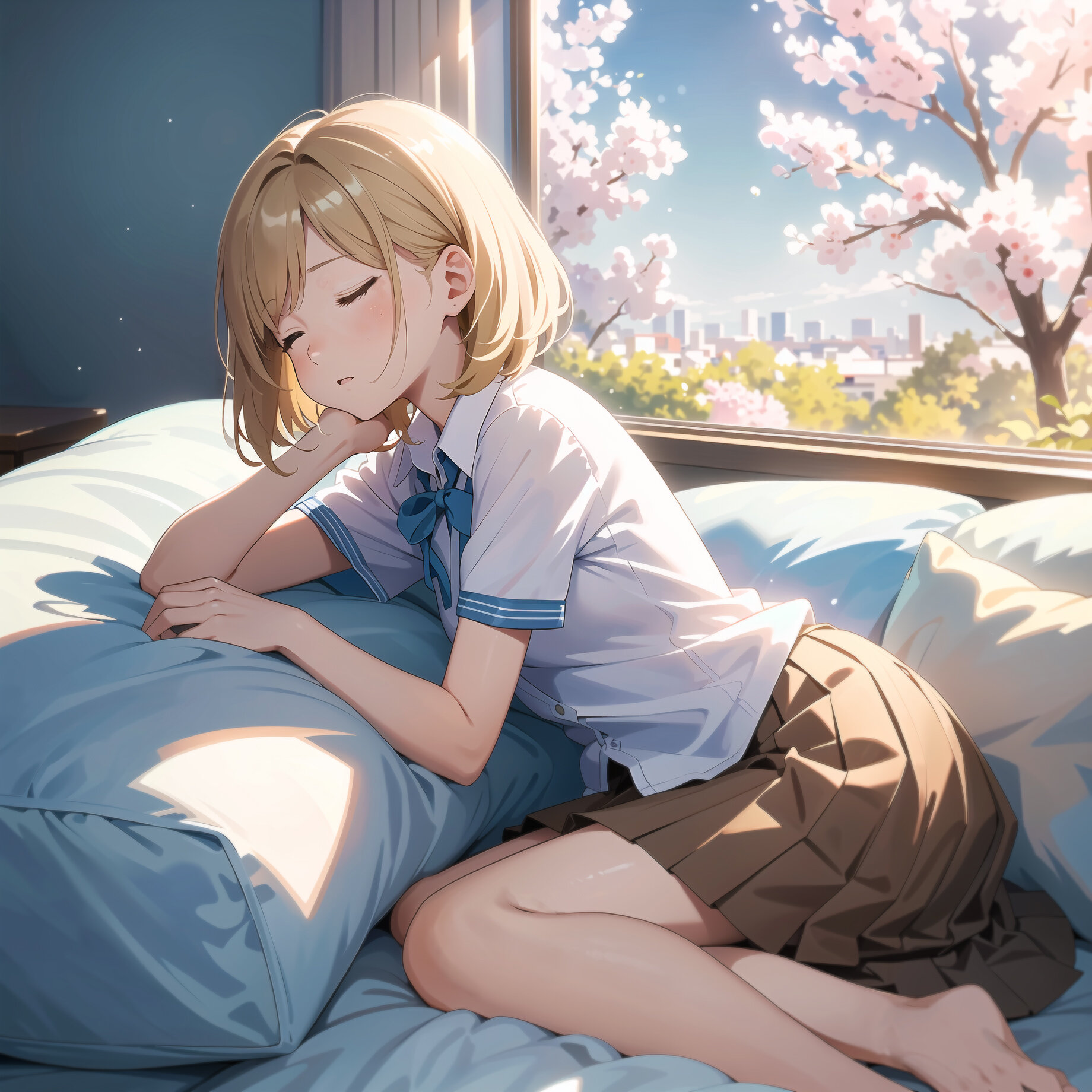 (masterpiece,high resolusion,illustration,ultra detailed 8k art,extremely detailed CG,official art,clothes reflecting light,detailed shiny skin,detailed background:1.3), ((highly detailed beautiful face and eyes)),(1girl,30yo,mature female:1.4),(small breasts:1.4), (beautiful brown short hair,beautiful brown eyes:1.2),(blush,closed eyes:1.1),(open mouth:1.0),(sleepy,Dozing off,side view,nap:1.3), (living room,large window, The scene is bathed in soft sunlight, evoking the quiet beauty and gentle warmth of spring's arrival:1.1), (beautiful blue sky:1.5), (fullbody shot:1.4), (wide angle,fisheye,side view:1.3),(blonde hair1.0), outside, (magnificient view:1.1), <lora:jk fashion_v2:0.7:lbw=ware>, (jk fashion,short sleeves,white shirt,pleated skirt:1.3), (beautiful brown eyes:1.3),<lora:flat2:-0.2>,<lora:tareme_gen3_dim1:0.4> <lora:glowingdust_20230806143817:0.2:lbw=back>(BOKEH:1.5),(nice hands,perfect hands:1.0),<lora:GoodHands-vanilla:1>(blonde hair:1.1),