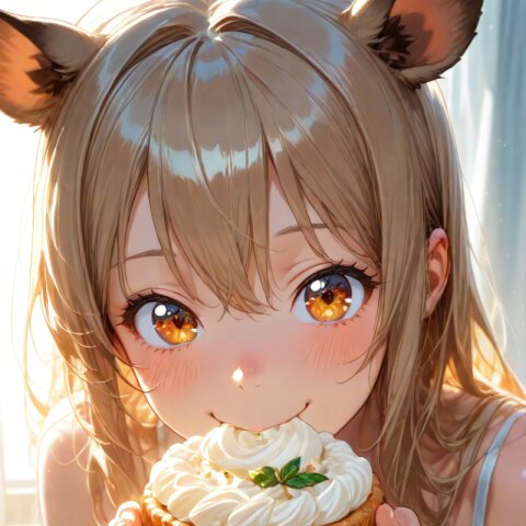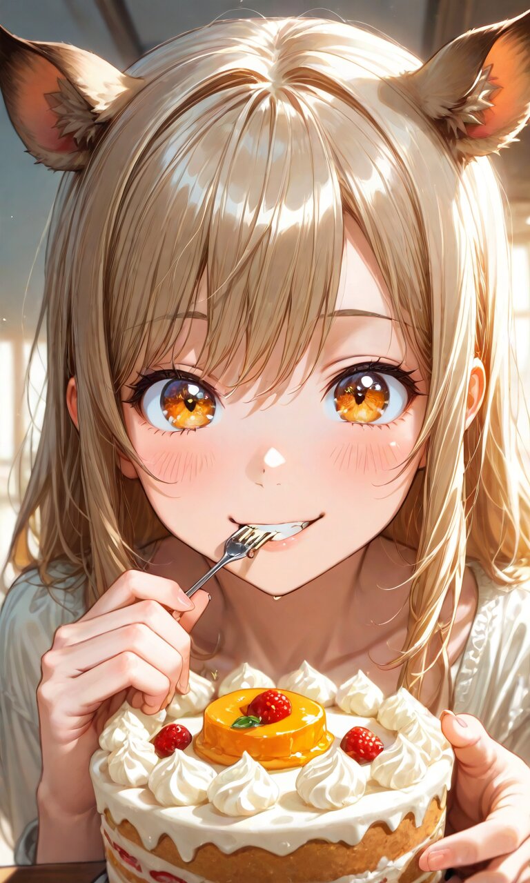 score_9, score_8_up, score_7_up, source_anime, masterpiece, best quality, high resolution, ultra-detailed, 2d, semi-realistic, moe heroine, sharp focus, nice hands, perfect hands, perfect anatomy, perfect structure, (ultra detailed foods), extreme close-up food:1.4, from the front, food focus:1.3, gaze at food:1.1, sparkling eyes, (on a early Morning, A living with a quiet atmosphere), joy, love, happy, blush, smile. A big sized birthday cake on a table. Open her mouth wide and eating cake. she wears mature casual fashion, she is elegance, adorable. light brown hair, long hair, amber eyes, wild boar's ears,