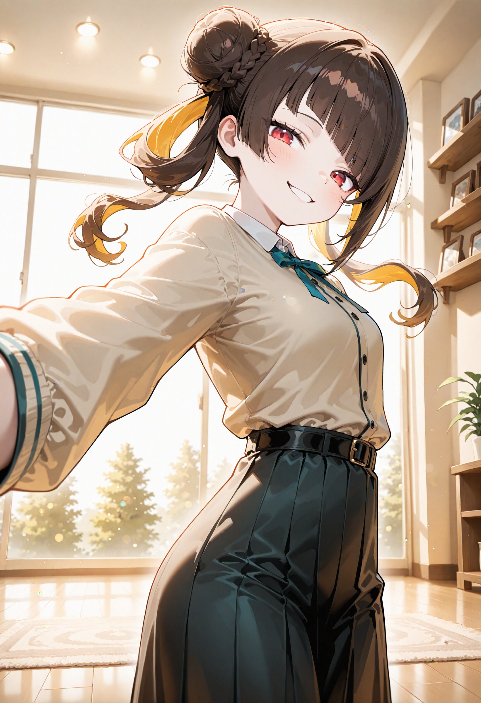 from side (Surveillance viewpoint:0.8) from below, looking down looking at viewer, Line art is drawn in a warm brown tone instead of black. The outlines have a soft, earthy feel, adding a gentle and nostalgic atmosphere to the illustration. 1girl, beautiful detailed eyes, cute face, cool, pale skin, skindentation, beautiful scarlet eyes, , , sepia hair, vanilla colored inner hair cute, prehensile hair, bun with braided base diagonal bangs , , first-rate female body perfect body beautiful small breasts, smart hips,, light blue crinoline warm comfy (naughty face:1.1) XD and thinking and happy, seductive smile depth of field, bokeh, Wood-grain wallpaper, wall shelf, dark brown sofa, round table, monochrome rug sunshine, direct lighting, spring morning sunlight, morning, sunshine, sidelighting, reaching towards viewer, fleeing (gradient background:1.0) masterpiece, best quality, amazing quality, very aesthetic, absurdres, you can add scenery, (volumetric lighting), To make the background more distinctive. professional art lots of details, , overexposure, shiny-glistening, (watercolor style:1.0), (pastel color style:0.0) <lora:noline (1):-0.5> <lora:sdxl2-flat2-512b:0.15> <lora:facelightup_xl_v10:0.5>