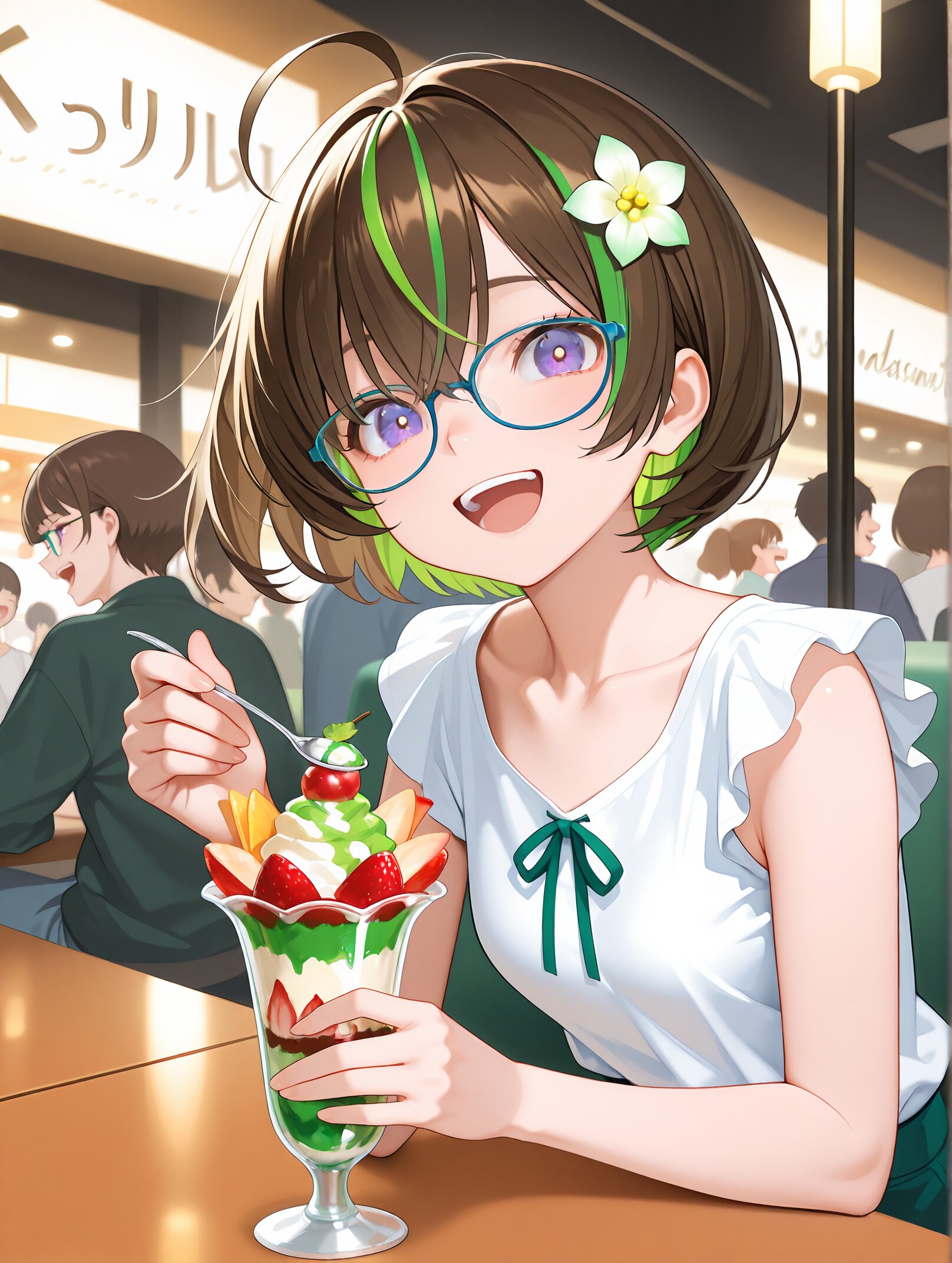 female,solo,(shorthair,brown hair:1.3),(green streaked hair:1.5),(hair detail:1.2),purple eyes,facial detail, (ahoge:1.2),(glossy hair:1.2), (bangs bangs:1.2),hair between eyes:1.1,(small breasts:1.2),(green striped bangs:1.1),(hair_flower:1.2),(details of glasses:1.1),blue-framed_eyewear,(green hair:1.2),green bangs,(emerald color inner hair color:1.2),white shirt,(kind_smile:0.8),(wide eyes:0.9),(happy:1.1),:d,(flying hair:1.2),casual,sleeveless,fruit parfait,food court,looking_at_viewer,crowd,holding spoon,(laughing:1.2),<lora:TestProject2-10:0.4>,Zasuko_V4_XL,