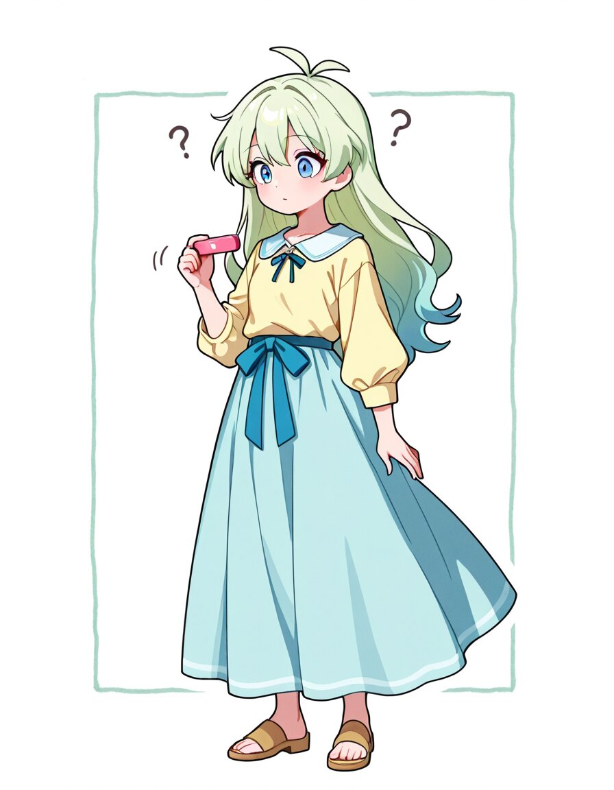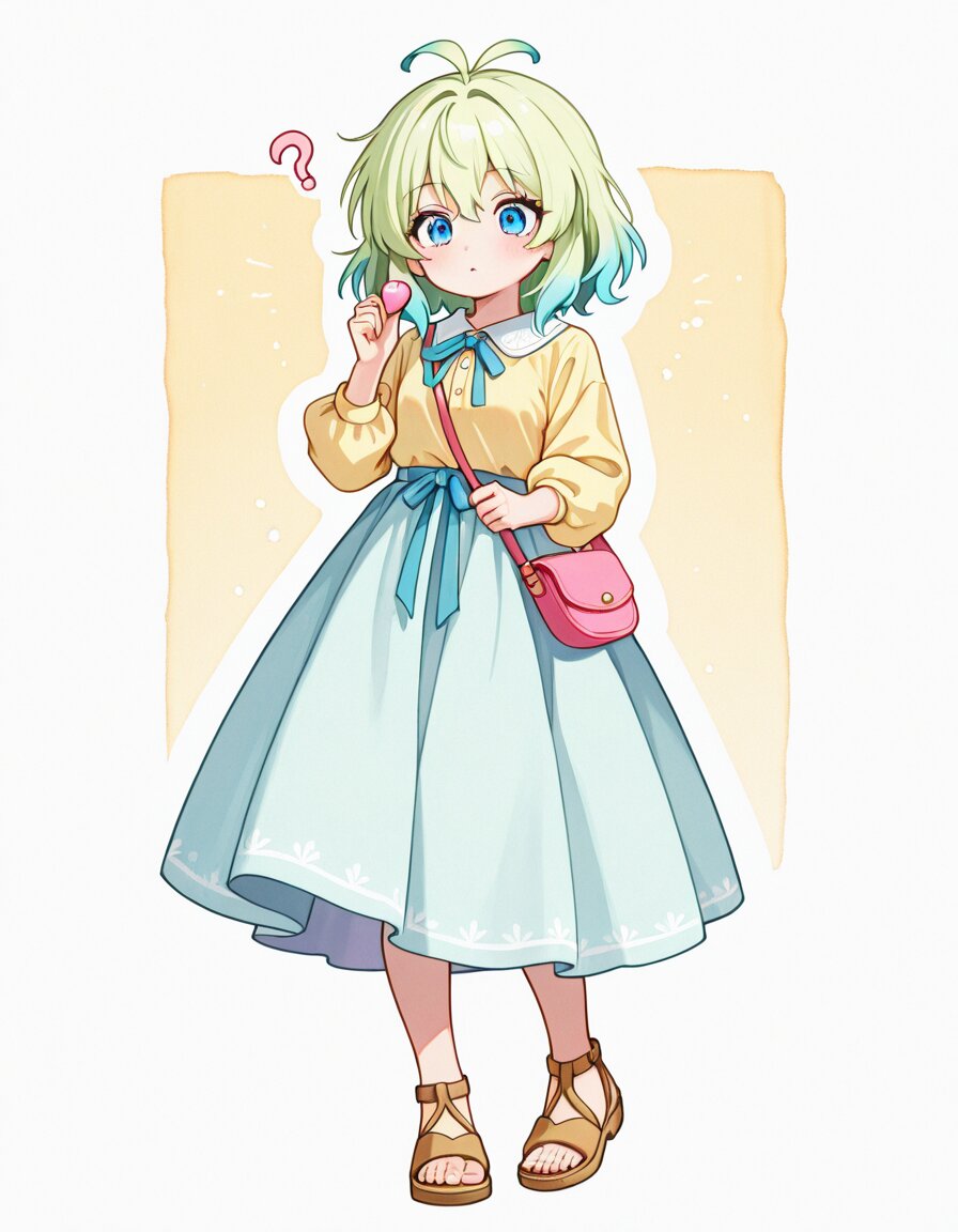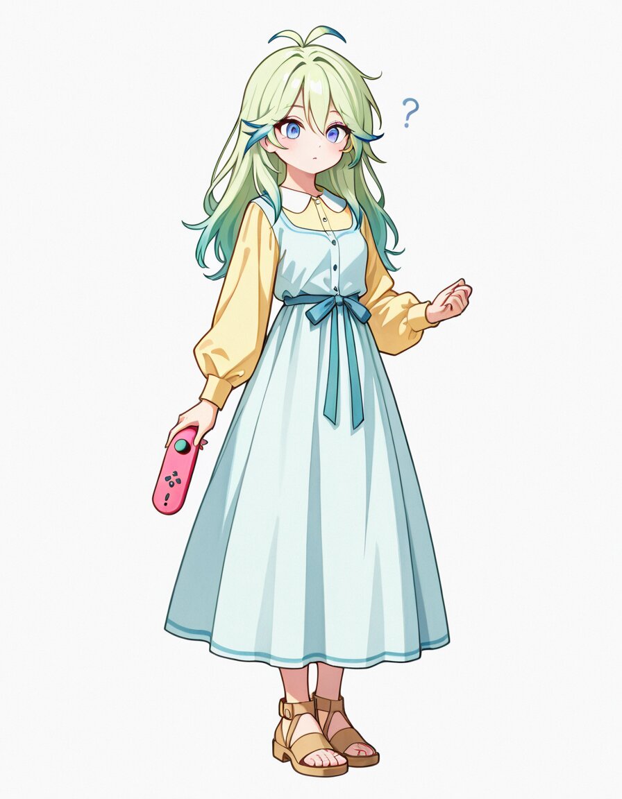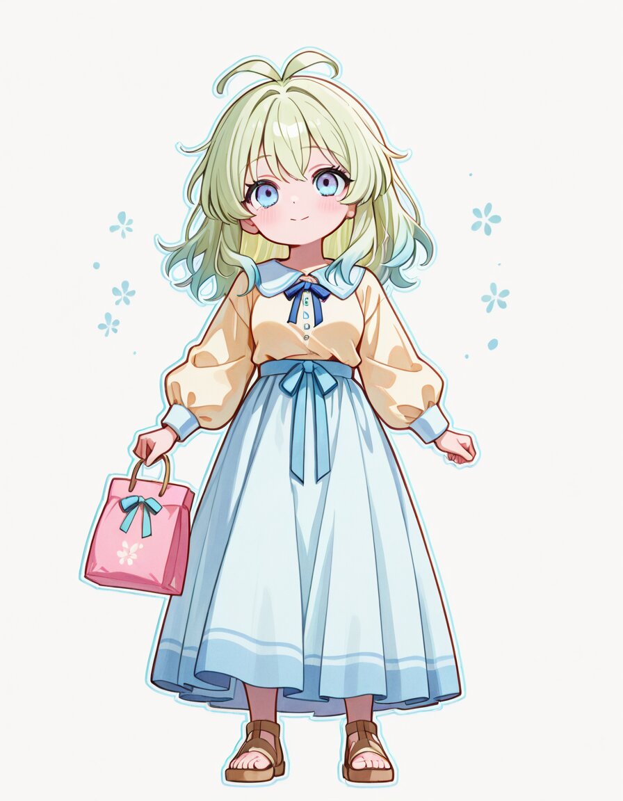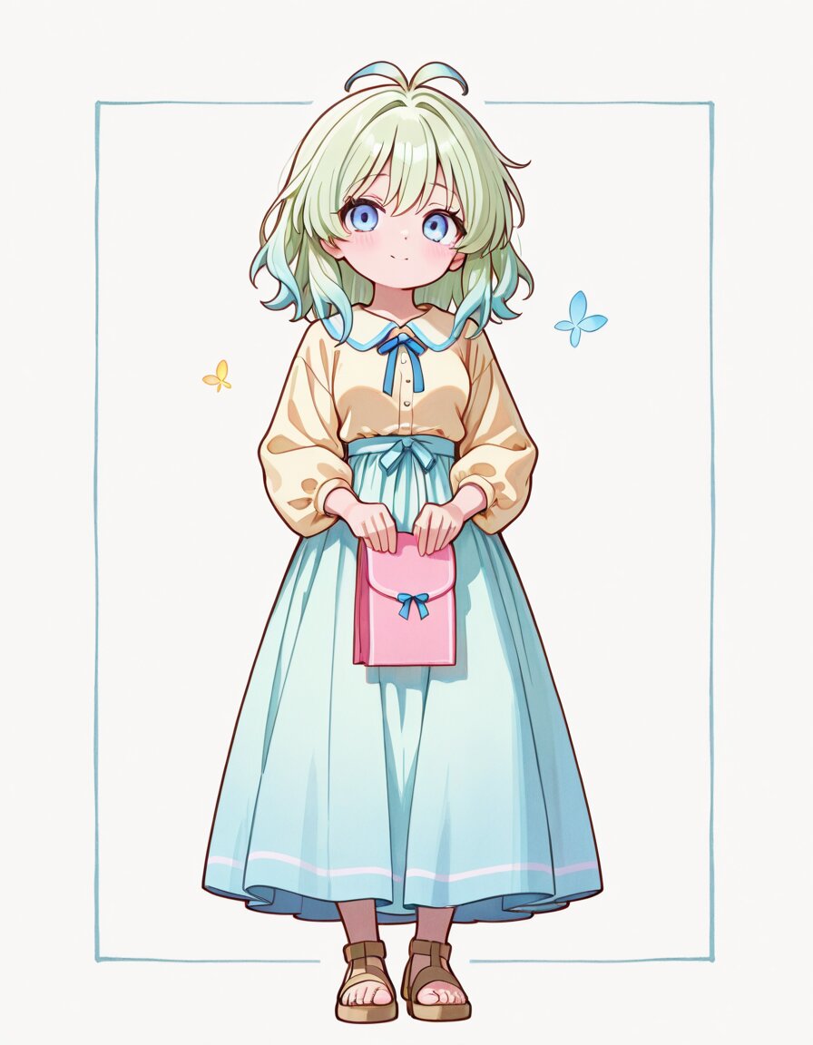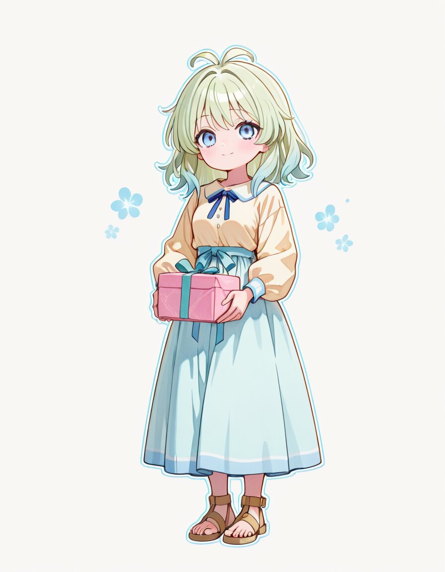 presenting a small pink package,offering a small package,1 woman,20yo,cute young woman,semi long length light green hair with blue tips,light blue eyes,wearing a light yellow long-sleeved long dress with a Peter Pan collar and a light blue ribbon at the chest and back,light blue trim on the skirt hem,light brown sandals,white simple background,clean lines,soft watercolor style,hard-edged,thick outline,antenna hair,double eyelids,long eyelashes,in a soft,medium breast,<lora:aidmaFLuxPro1.1_v0.3_IL:1>,<lora:checkpoint-e33_s297:1>,