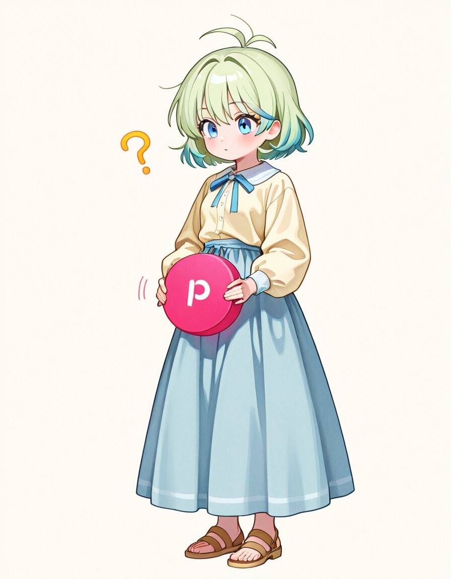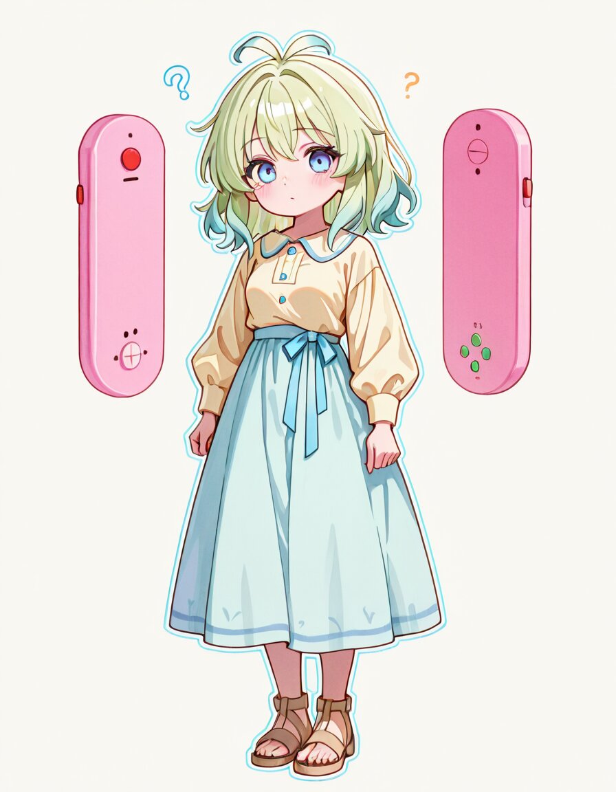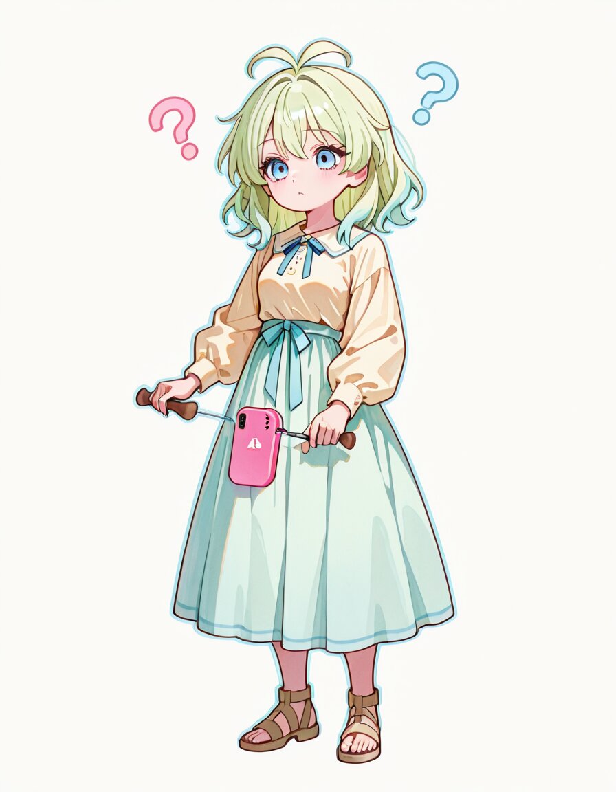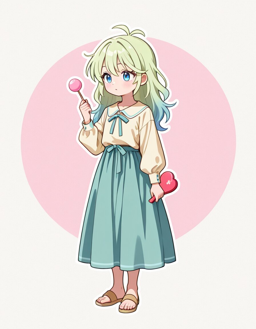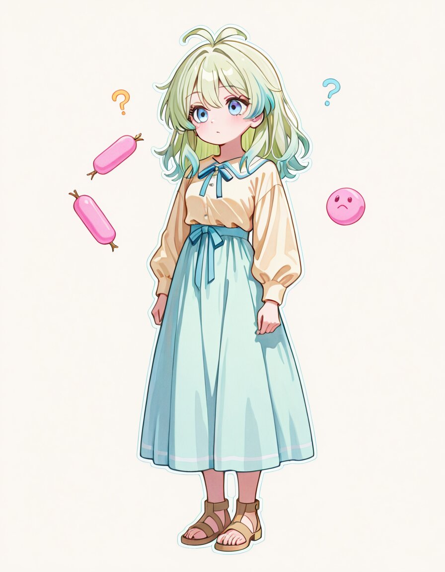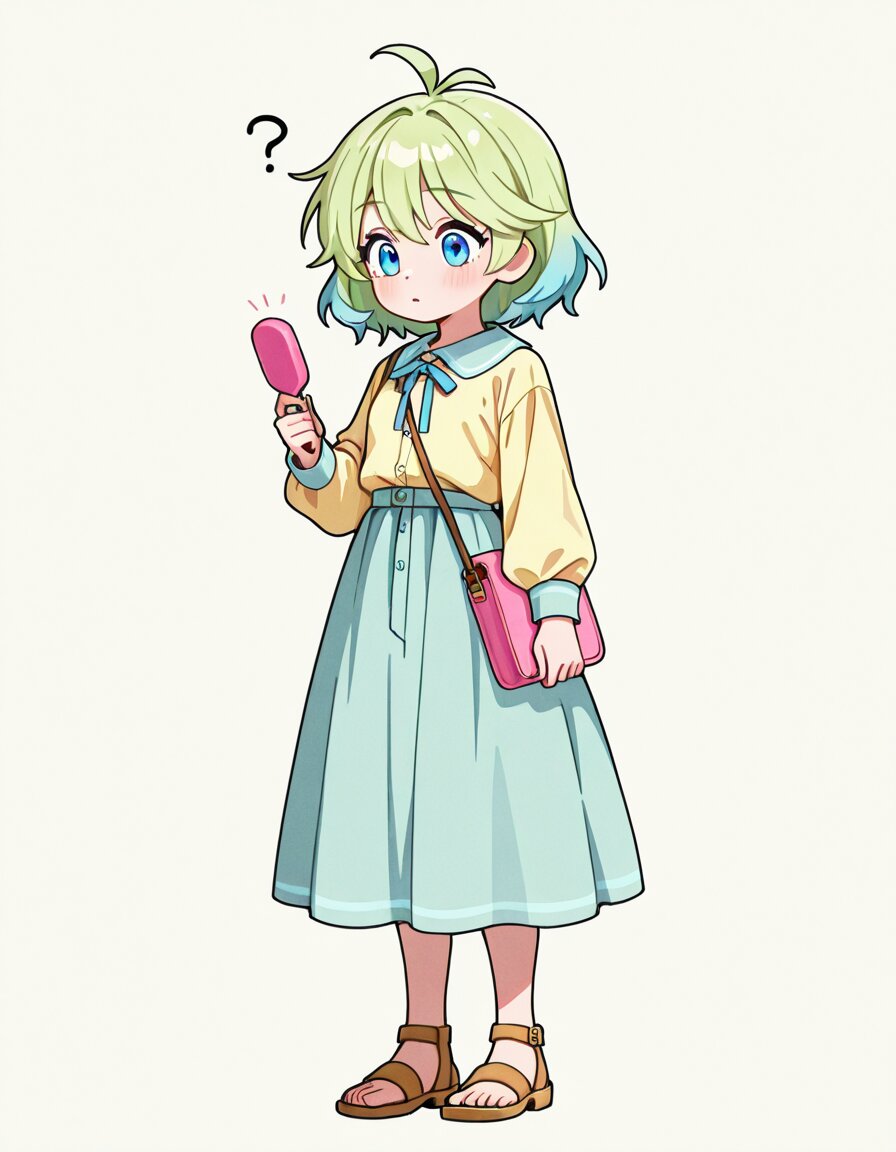 presenting a small pink package,offering a small package,1 woman,20yo,cute young woman,semi long length light green hair with blue tips,light blue eyes,wearing a light yellow long-sleeved long dress with a Peter Pan collar and a light blue ribbon at the chest and back,light blue trim on the skirt hem,light brown sandals,white simple background,clean lines,soft watercolor style,hard-edged,thick outline,antenna hair,double eyelids,long eyelashes,in a soft,medium breast,<lora:aidmaFLuxPro1.1_v0.3_IL:1>,<lora:checkpoint-e33_s297:1>,