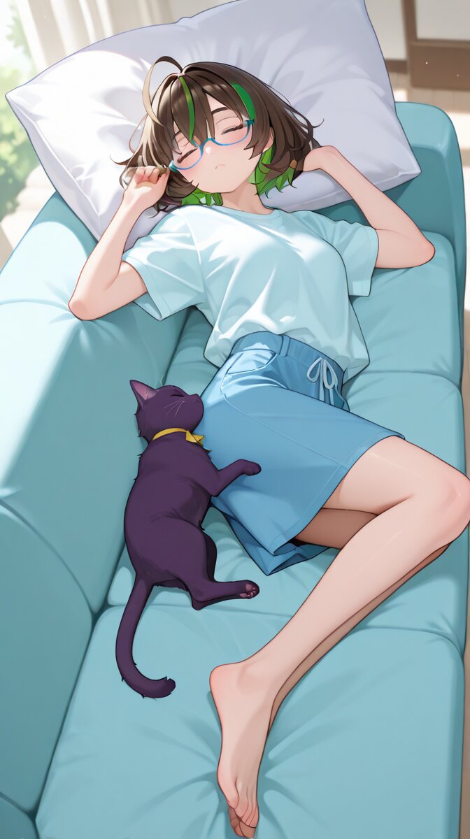 female,adult woman,solo,(short hair,brown hair:1.3),(green streaked hair:1.5),closed mouth,closed eyes,facial detail,hair detail, (ahoge:1.2),(glossy hair:1.3),(bangs bangs:1.2),(hair between eyes:1.1),(small breasts:1.2),hair_flower, (details of glasses:1.1),blue-framed_eyewear,green hair,(emerald color inner hair color:1.2),full body,upper_body,casual,winter_clothes,blue clothes,looking_at_viewer, <lora:TestProject2-10:0.7>,Zasuko_V4_XL,lip,pants style,forest park,on the sofa,lying down,purple cat,sleeping,