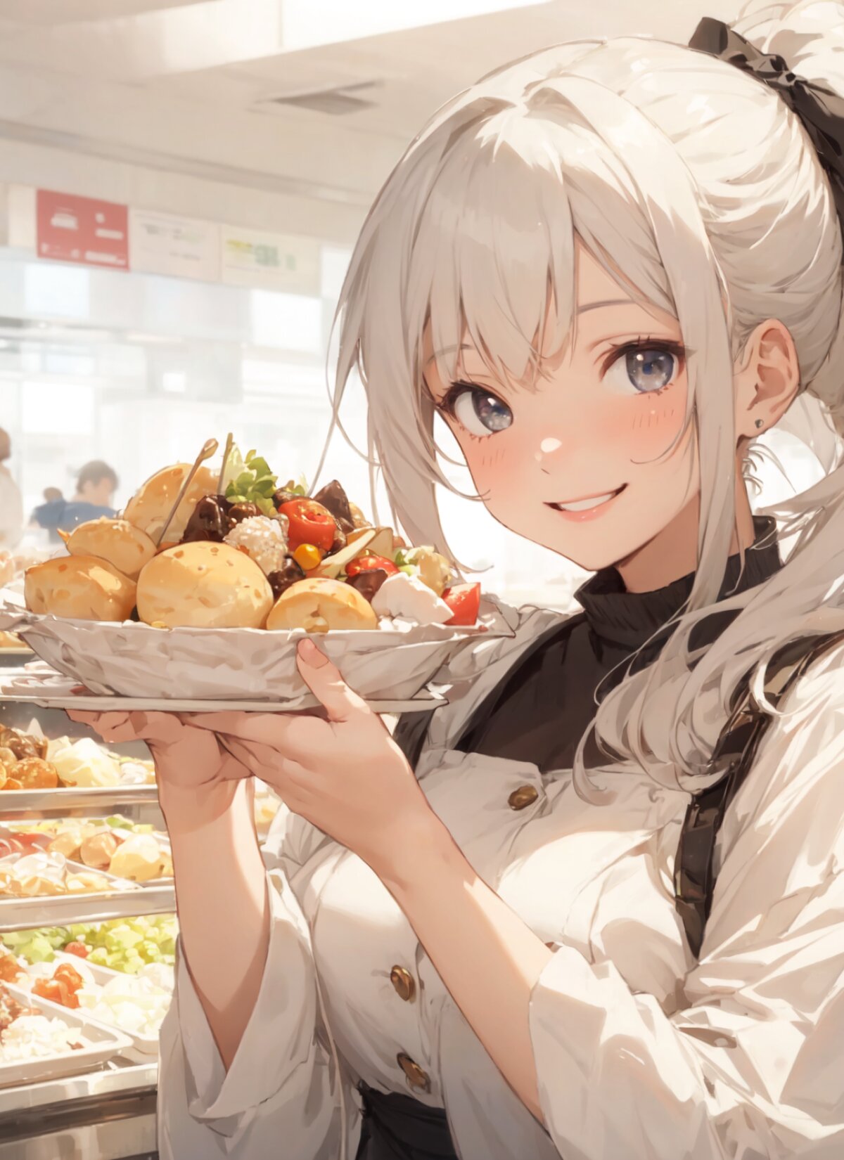 masterpiece, best quality, 1girl, buffet,food court,food shops,With lots of food in both hands,looks so happy,smile,white ponytail,