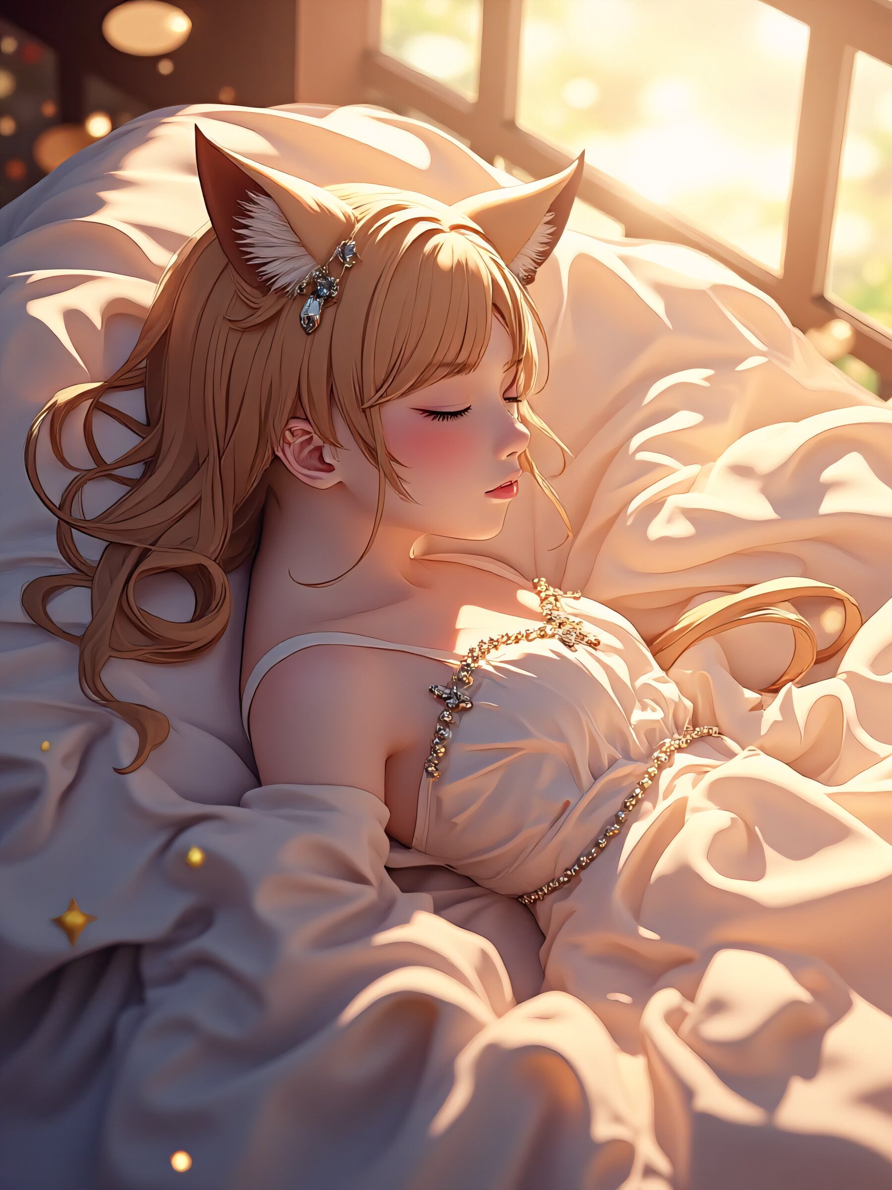 An anime-style fox-eared girl with light brown hair, peacefully napping in an elegant, flowing dress. The soft fabric drapes gently around her, shimmering under the ambient light. Her delicate fox ears twitch slightly as she breathes calmly, lost in a serene dream. Golden strands of her hair catch the glow of the setting, adding warmth and depth to the scene. The background features a tranquil, dreamy atmosphere—perhaps a sun-dappled garden, a cozy traditional veranda, or a moonlit field—enhancing the soothing and enchanting mood,frills
