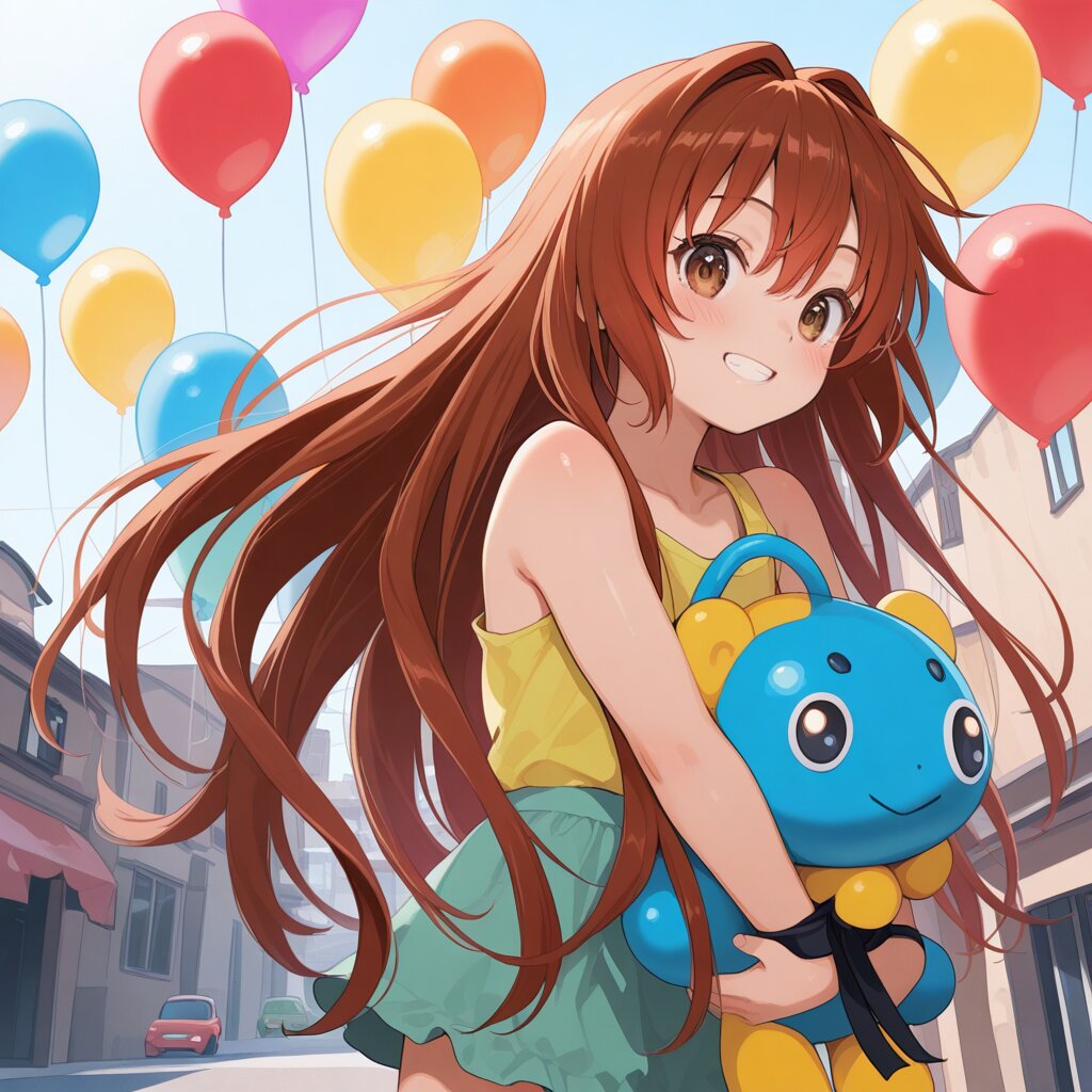 masterpiece,best quality,amazing quality,very aesthetic,absurdres,newest,highres,okashirastyle,8k,extremely detailed CG unity 8k wallpaper,(perfect face:1.2),1boy,1lady,27yo,long_hair,brown_hair,red_eyes,hair_between_eyes,very_long_hair,brown_eyes,red_hair,floating_hair,hair_intakes,straight_hair,shiny_skin,medium_breasts,awesome clothes, outdoor,(smile:1.5), BREAK,On Children's Day, elder sister and young brother share a joyful moboyst. The elder sister, with her long hair tied up in a neat ponytail, playfully smiles while holding a colorful balloon. Her eyes twinkle with exciteboyst as she looks at her younger brother. The young brother, with his curly brown hair bouncing, beams back at her, gripping a small toy car in his hand. They stand against a background of vibrant colors from a bustling street fair, where laughter and music fill the air.