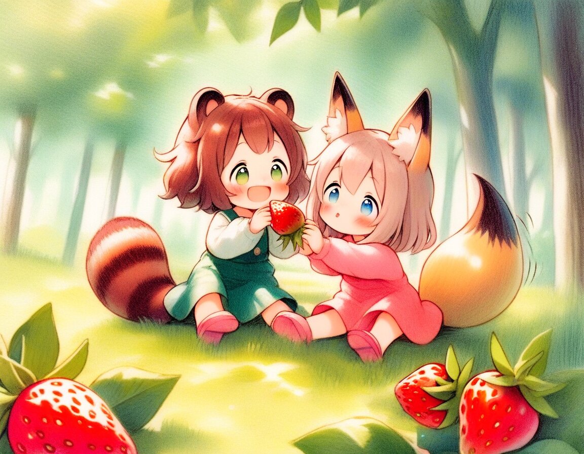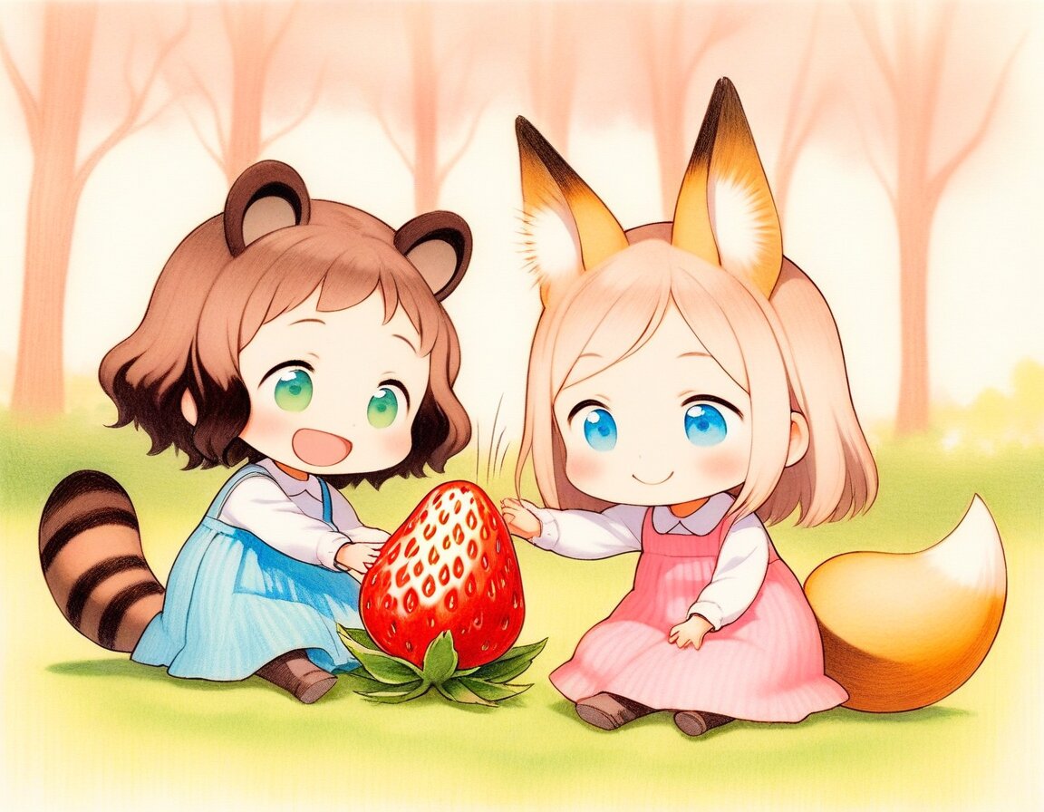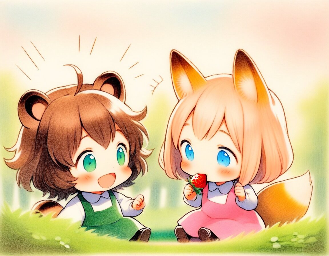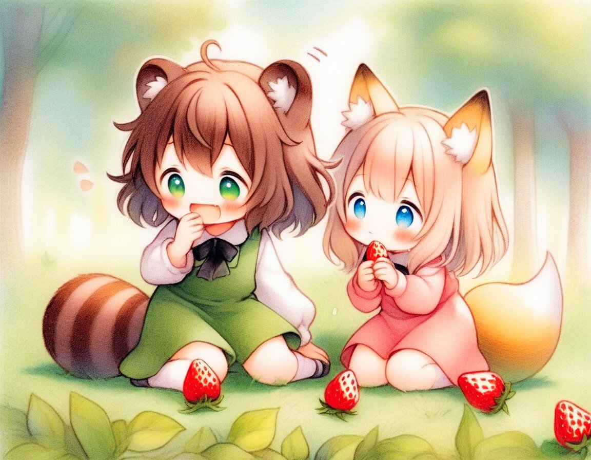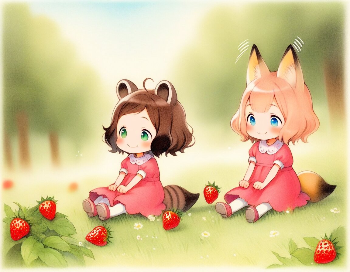 2girls, loli, mid, general, traditional media, picturebook-style, (colored pencil drawing), pastel colors, soft tone, (blurred boundaries, drawing lines, Paper texture), cute, deformed, ultra-detailed background, (masterpiece, best quality, high score, great score), dynamic pose, dynamic angle, dynamic composition, Wild strawberries, fruiting strawberries, eatting strawberry, sitting on grass, sunlit forest clearing, soft sunlight filtering through trees, cheerful expressions, relaxing spring atmosphere, Wild strawberries grow abundantly throughout the forest, picking strawberry, BREAK 2girls, loli, dark brown hair, short hair, messy hair, bangs, green eyes, tareme, (dark brown raccoon ears, dark brown raccoon tail with striped pattern), laughing, happy, green pinafore dress, BREAK 2girls, loli, light brown hair, medium hair, bangs, blue eyes, (light brown fox ears, Light brown fox tail with white tip, petite), smile, happy, pink pinafore dress,
