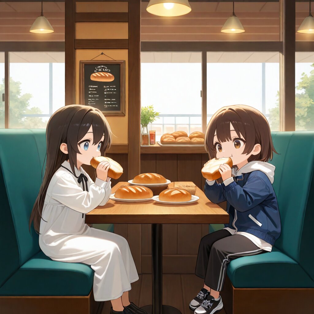 masterpiece,best quality,highres,highly detailed,detailed eyes,general,character focus,chibi,2girls,smile,long sleeves,jacket,long shirt,long pants,eating bread,bread on plate,sitting on chair,restaurant of bakery,restaurant,morning,