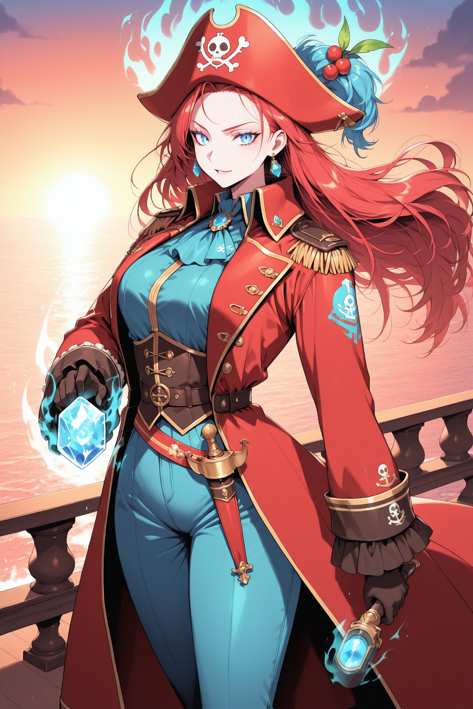 1girl, solo female, pirate empress, (deep cherry red long hair:1.3), (transparent crystal blue eyes:1.2), (elegant yet fierce expression:1.2), (proud posture:1.3), (standing on ship deck:1.2), (ocean backdrop:1.2), (sunset lighting:1.3), (ornate pirate captain outfit:1.4), (deep red and crystal blue color scheme:1.3), (golden accessories:1.2), (cherry red captain coat:1.3), (commanding aura:1.3), (slender powerful figure:1.2), (wind blowing hair and clothes:1.2), (regal appearance:1.3), (holding navigation tool:1.1), highres, masterpiece, best quality, detailed
