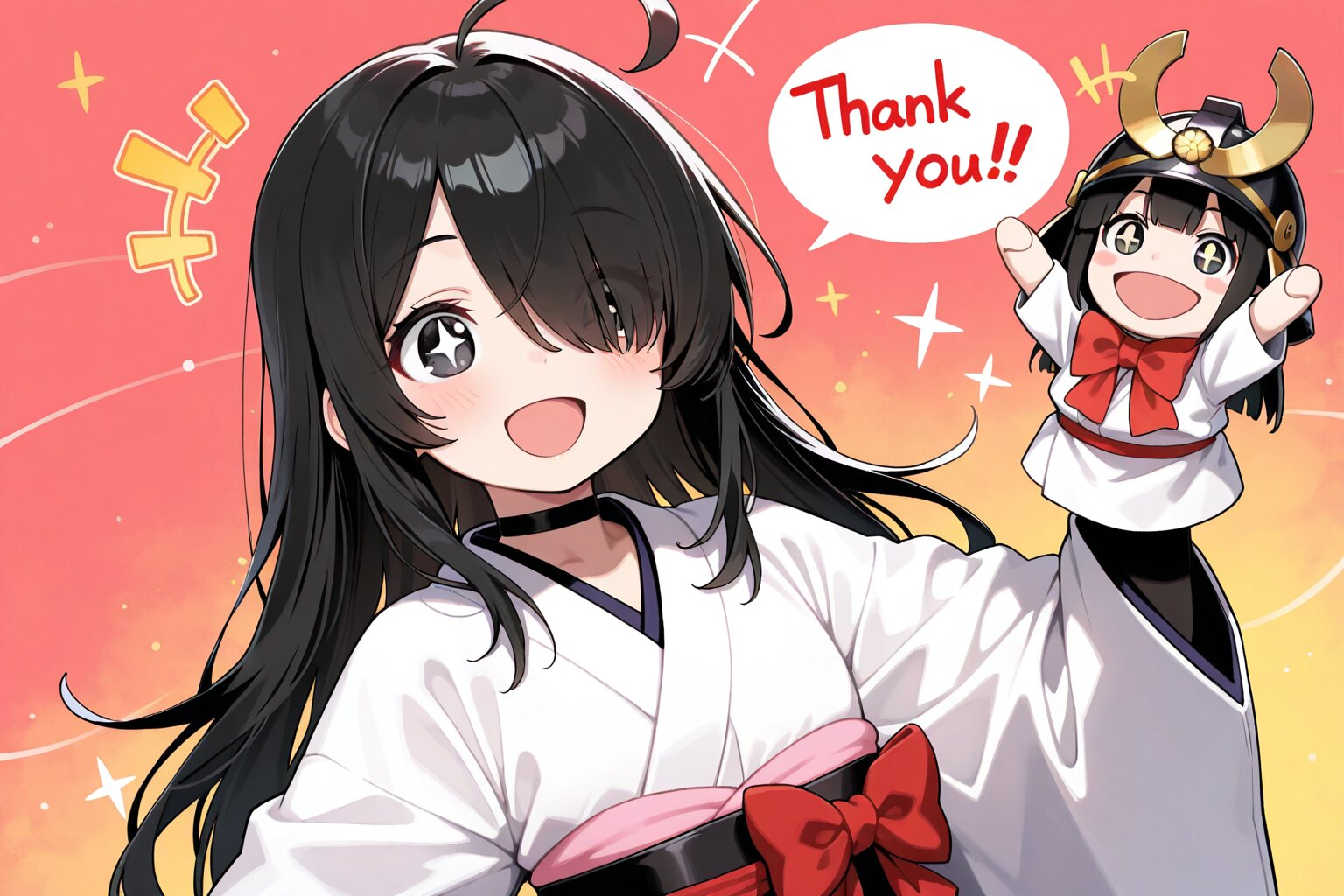 1 little girl, solo, diagonal angle, upper body, masterpiece, best quality, amazing quality, very aesthetic, black hair, long hair, ahoge, (hair over one eye:1.2), black eyes, +_+, open mouth, smile, cheerful, +++, notice lines, choker, white kimono, bow own head, spoken thank you, samurai helmet, hand puppet,