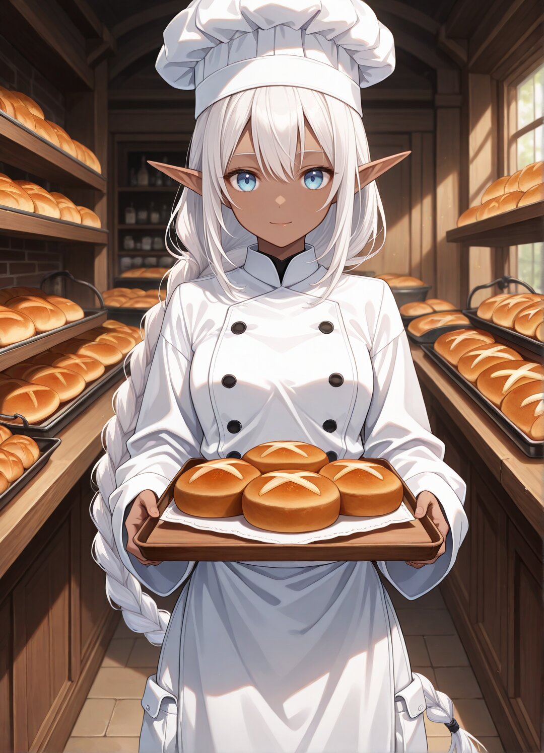 masterpiece,best quality,highres,highly detailed,detailed eyes,general,1girl,solo,17yo,(dark skin),cute girl,slender,medium breasts,Very long sleeves that cover wrists,dark elf,Elf ears,pointy ears,(very long white hair,long low braid),Pale blue eyes,light smile,close mouth,(white clothes,chef's hat, White chef's clothes,very long white cargo pants, white apron),boots,slender girl,holding Freshly baked bread on tray,in bakery,looking at viewer,cowboy shot,fantasy,