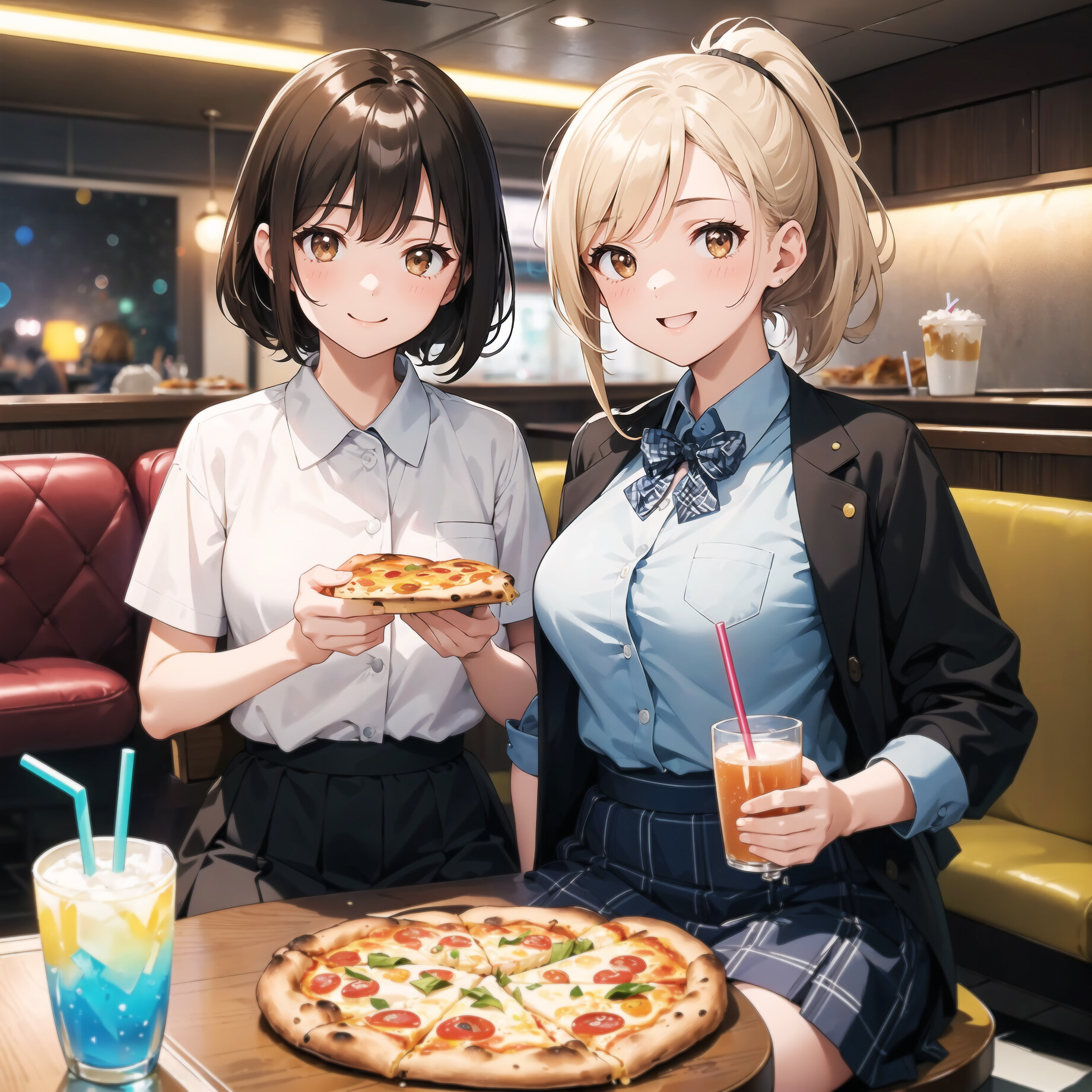 (white theme:1.4),(masterpiece,high resolusion,illustration,ultra detailed 8k art,extremely detailed CG,official art,clothes reflecting light,detailed shiny skin,detailed background:1.3), ((highly detailed beautiful face and eyes)),(2 girls,20yo,mature female:1.5),(small breasts:1.4),(curvy:1.1), (beautiful brown short hair,ponytail,beautiful brown eyes:1.2),(laughing widh open eyes,blush,looking at viewer:1.1),(open mouth:1.0), (A high school girl eating pizza in an American diner, retro 1950s style interior with neon signs and checkered floors, cozy booth seating, the girl wearing a casual school uniform or trendy teen outfit, enjoying her meal with a happy expression, warm ambient lighting:1.2), <lora:MultipleGirlsGroup:0.25:lbw=pose>(2girls,lineup:1.45),(from front:1.4),(blonde hair:1.0),(across the table,pov,sitting,drink,large table,across table:1.4), <lora:jk fashion_v2:0.7:lbw=ware>, (jk fashion,casual clothes:1.2), (beautiful brown eyes:1.3),<lora:flat2:-0.3>,<lora:tareme_gen3_dim1:0.4> <lora:glowingdust_20230806143817:0.2:lbw=back>(BOKEH:1.5),(nice hands,perfect hands:1.0),<lora:GoodHands-vanilla:1>(blonde hair:1.0),(mature female:1.5)<lora:acrossTableConcept_v10:0.7:lbw=pose> <lora:FoodAssets-15:0.25>(acrossTable:1.4)