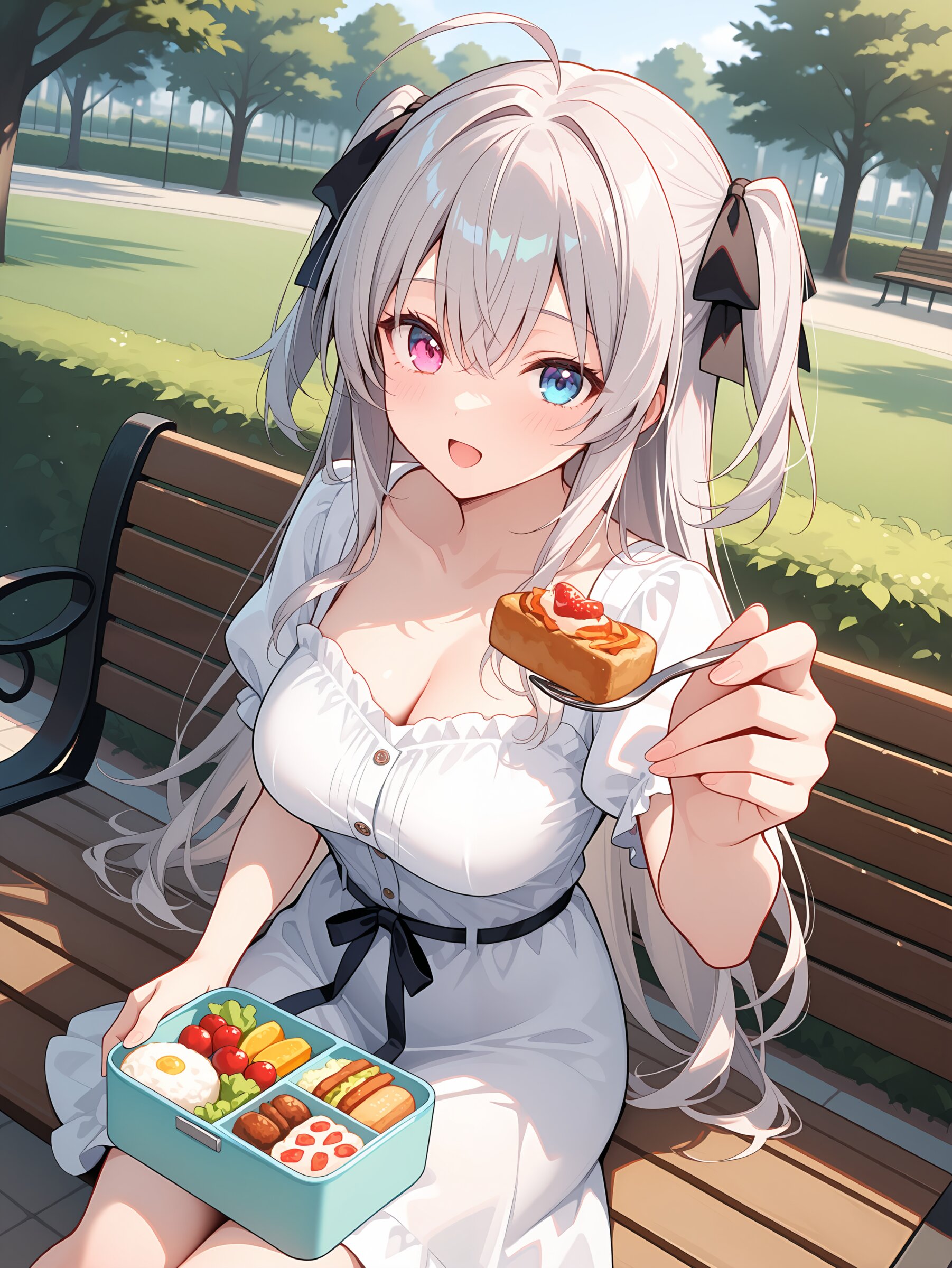 clothed, casual wear, puffy sleeves, lunchbox, park, park bench, feeding to viewer, foreshortening, close to viewer,