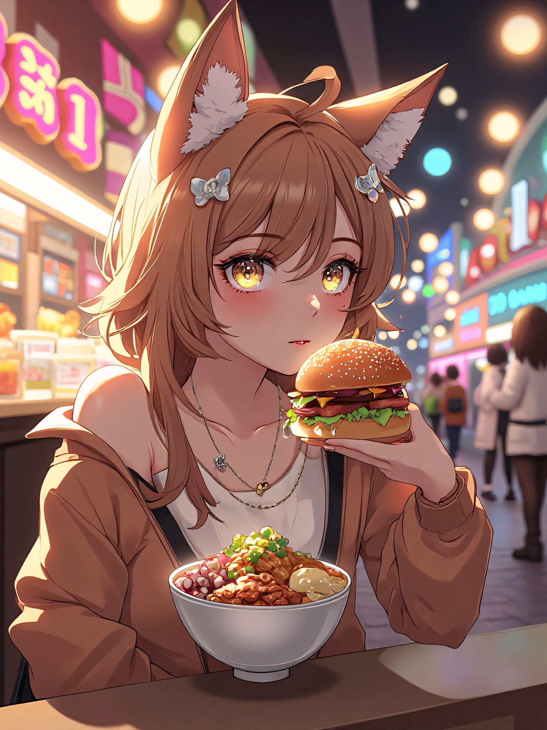 An anime-style fox-eared girl with light brown hair, sitting casually in a bustling food court on a quiet Tuesday afternoon. She wears a trendy yet cozy outfit, her fluffy ears twitching slightly as she enjoys a delicious meal. Her golden eyes sparkle with delight as she lifts a steaming bowl of ramen or a perfectly stacked burger, savoring the moment. Neon signs and warm lighting from overhead fixtures reflect softly in her hair, adding depth to the scene. The background features a variety of food stalls and diners, creating a lively yet relaxed atmosphere.