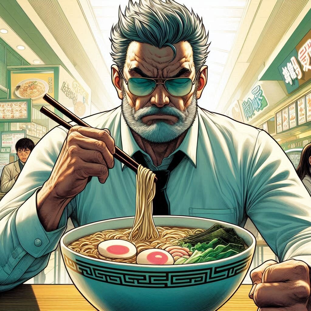 映画のポスターの様なイラスト。映画のラストシーンの様なダイナミックな構図と情景。オフィシャルアート。 日本のアニメの画風の渋いキャラ。メガネをかけたマッチョの老人。デパートのフードコート。彼が座るテーブルの上には超巨大なラーメンが置かれている。彼はこれから戦場へ向かうかのような真剣な眼差しで一心不乱にラーメンを啜る。