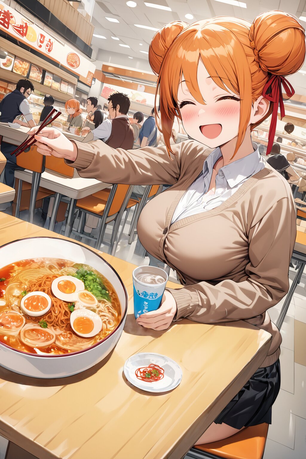 1girl, food court,(many customers),food shop, large breasts, orange hair,(double bun),(center parted bangs),sideburns,hair side red string ribbon, small orange eyes,(close eyes), noseblush,naughty smile,open mouth,happy,delicious, cardigan,mini skirt,kneehighs, sitting on chair,ramen on table,holding chopsticks, cowboy shot,dynamic angle,looking at viewer,from side:0.8, ((best quality)),((very high resolution)),full color,((ultra detailed)),extremely detailed CG,super fine illustration, manga style,hyperrealistic, perfect anatomy,super detailed skin,(beautiful detailed clear eyes),