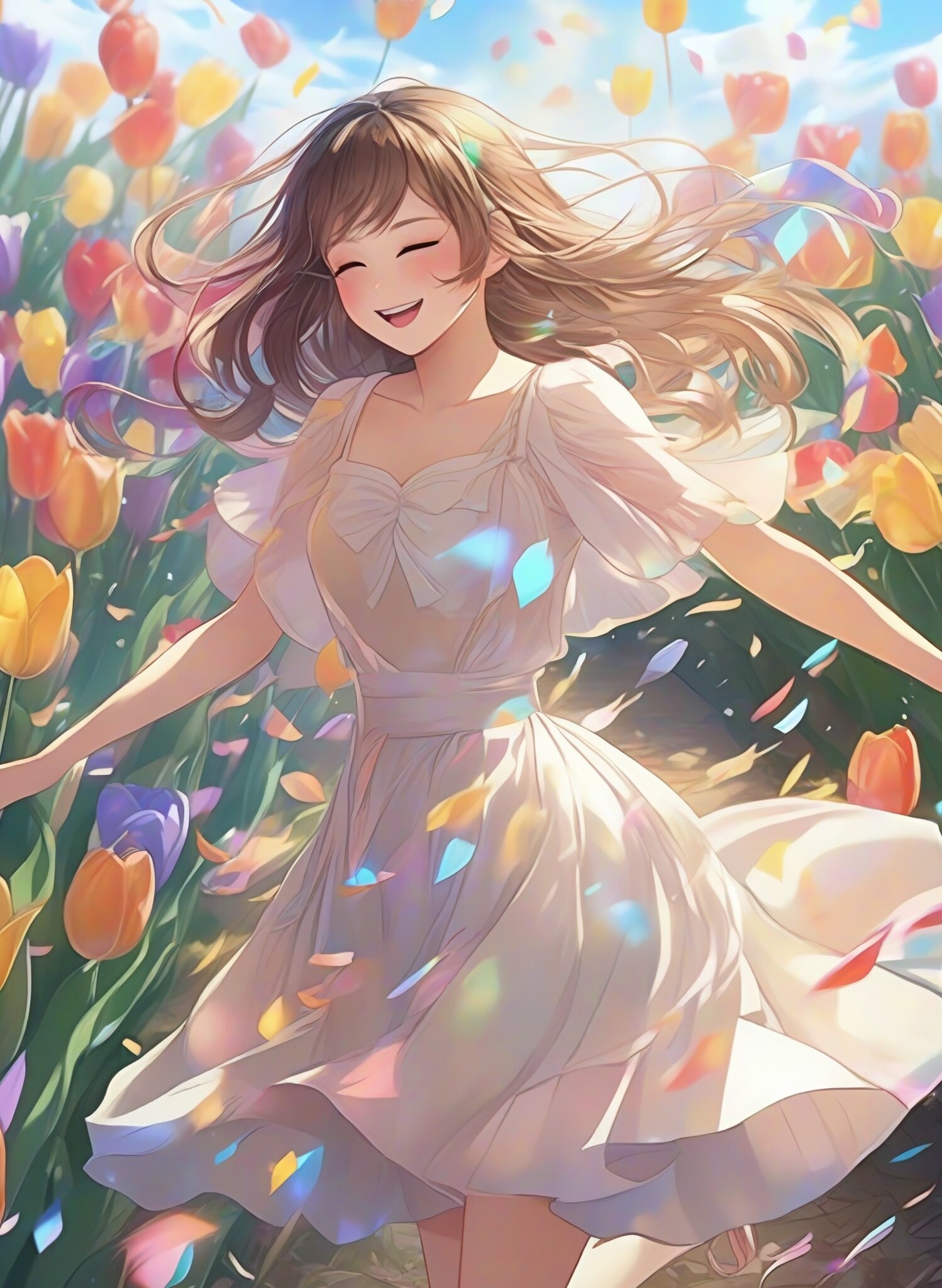 masterpiece, best quality, animation style, anime colored, look at viewer,(tulip:1.0), holographic sparkling, falling petals, several colored tulip petals are dancing in the wind, 1 lady, rainbow, happy, smile, in heat, middle breasts, full body, buried in rapeseed, BREAK, white mini dress, mini skirt, ultra-detailed, illustration, beautiful detailed eyes, sun, shining,