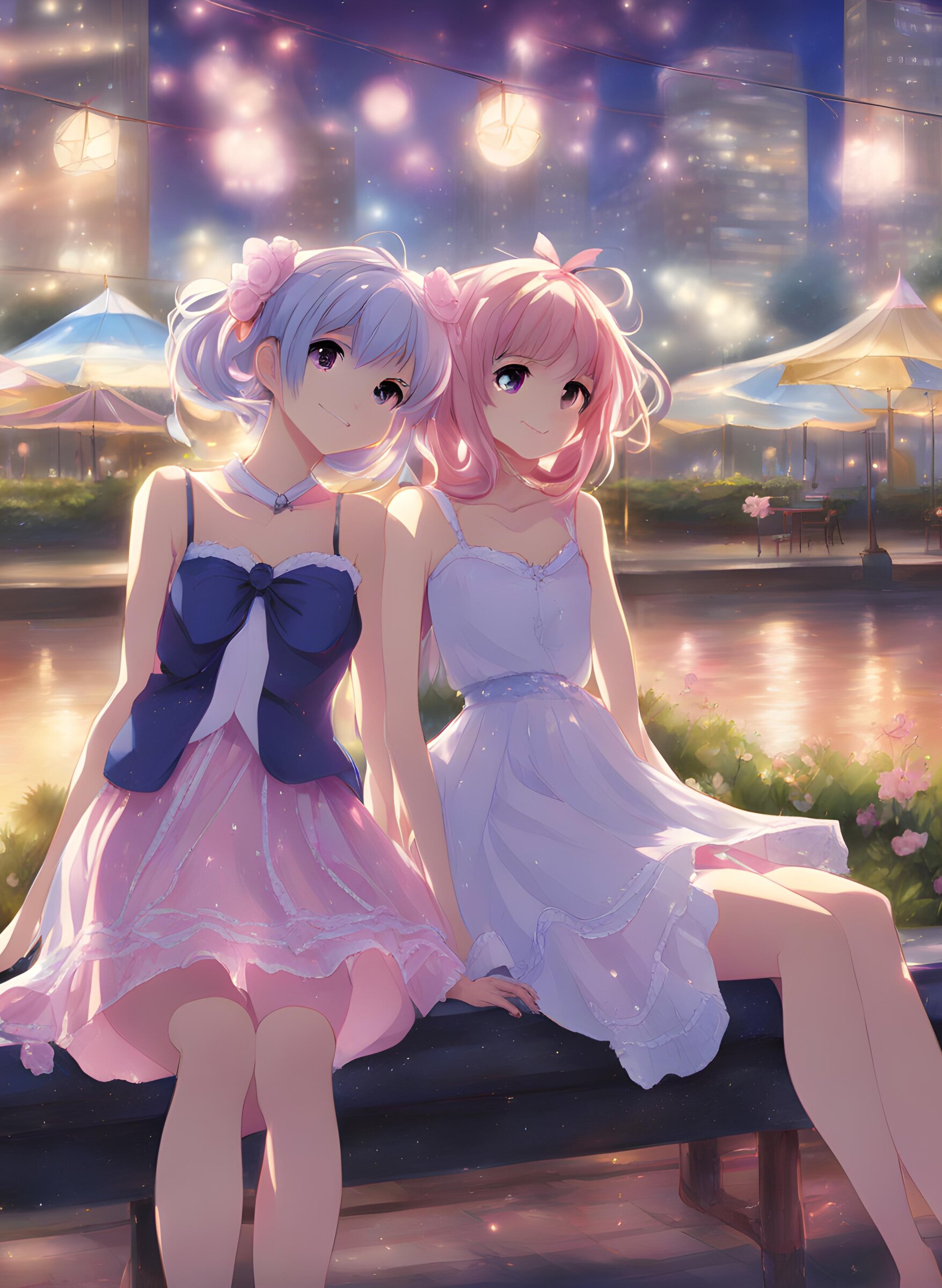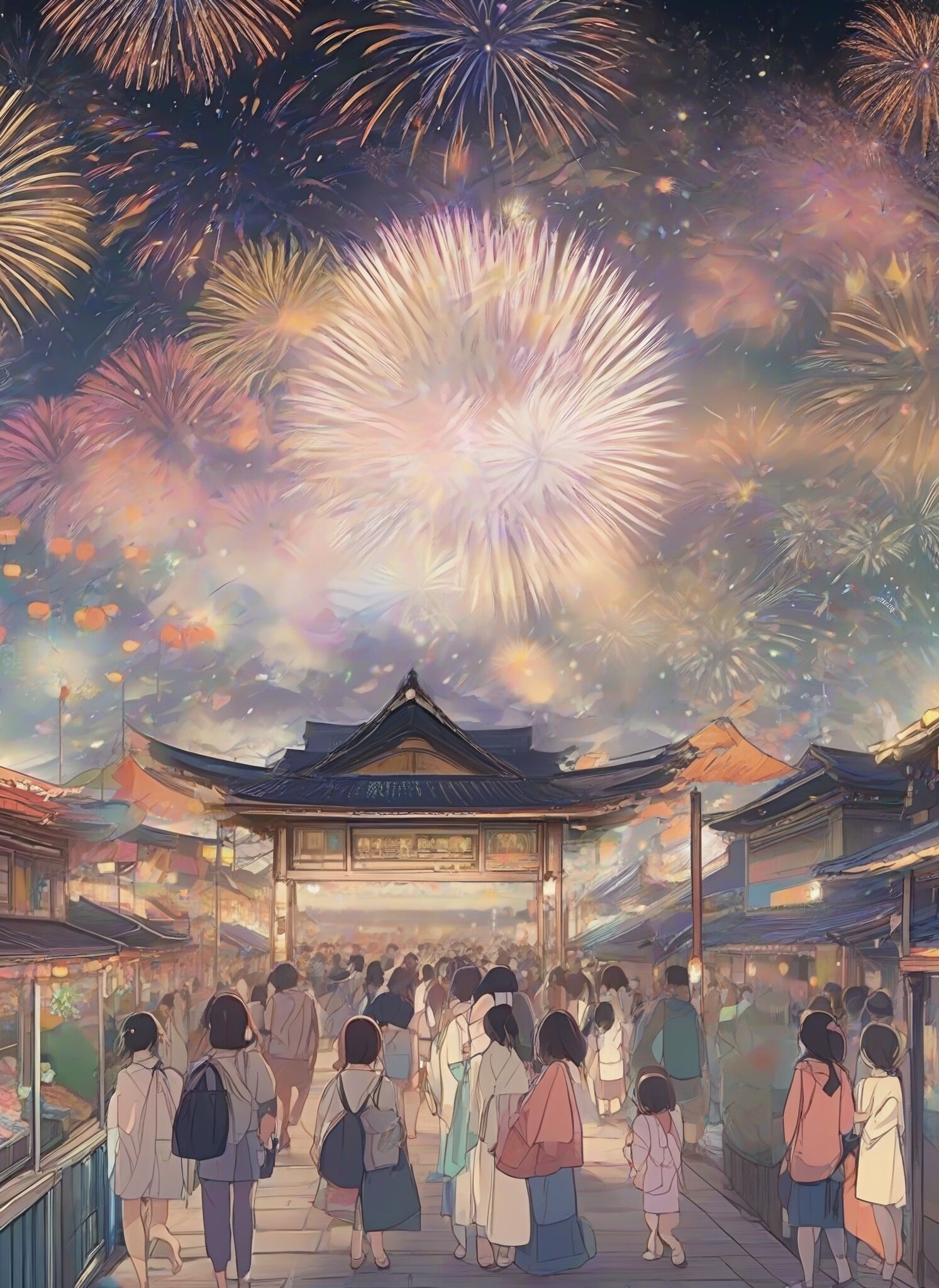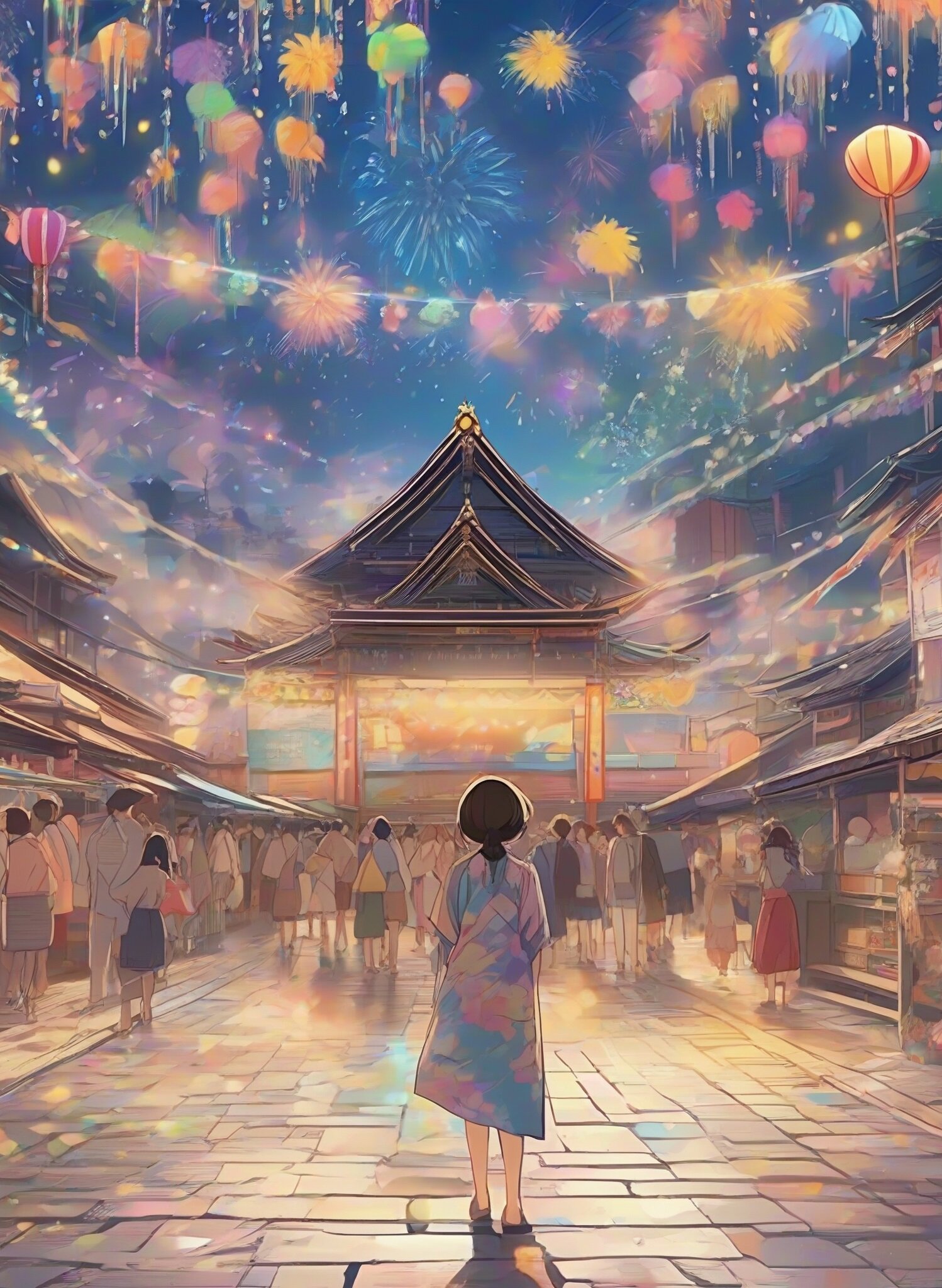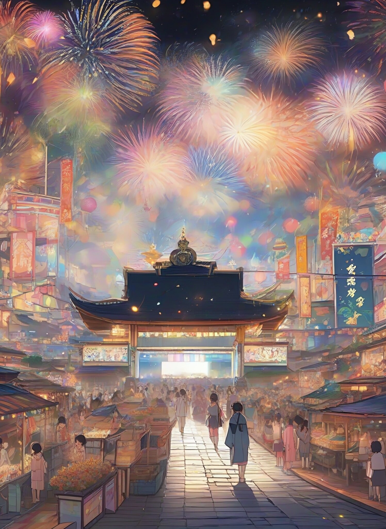 masterpiece, best quality, animation style, anime colored, illustration,dynamic angle, summer night, a lively summer festival features rows of stalls. BREAK Fireworks brightly shine in the night sky. BREAK A girl in a yukata looks up at the fireworks with a happy expression.(magic particles:2.0), rainbow,