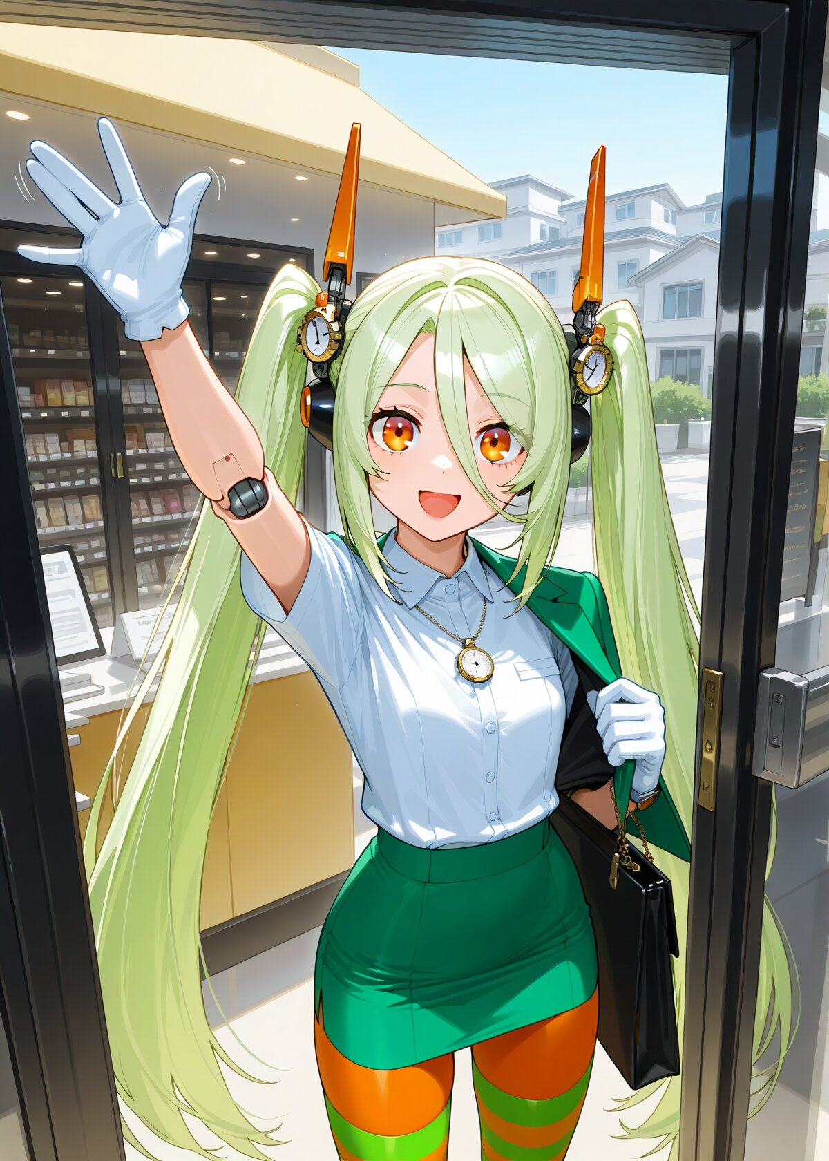 1Robots lady, solo, Prosthetic, Machine joints, Mechanical accessories, mechanical hair ornaments, orange eyes, light Green hair, very long hair, rabbit style twintails, parted bangs, long bangs, long side hair, hair between eyes, perfect center part, holding electric massagers on shoulders, department store lady, Green office lady outfit, white gloves, orange legwear, green legwear, striped legwear, mini tight skirt, big Watch hair ornament,, watches, watch necklace, department store, house, "(:d:2.0), one hand waving and arm up, other arm down, motion lines," looking at viewer, morning,
