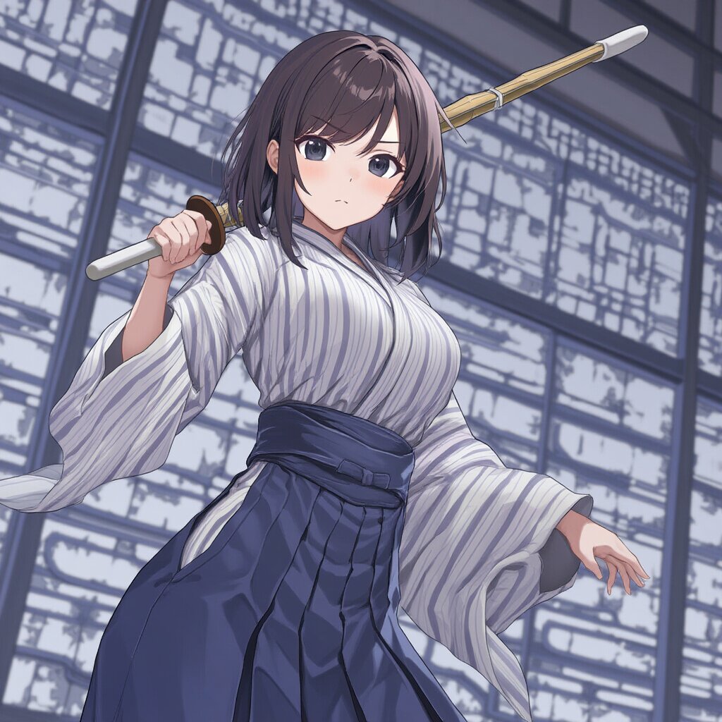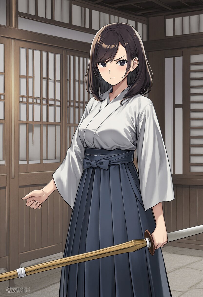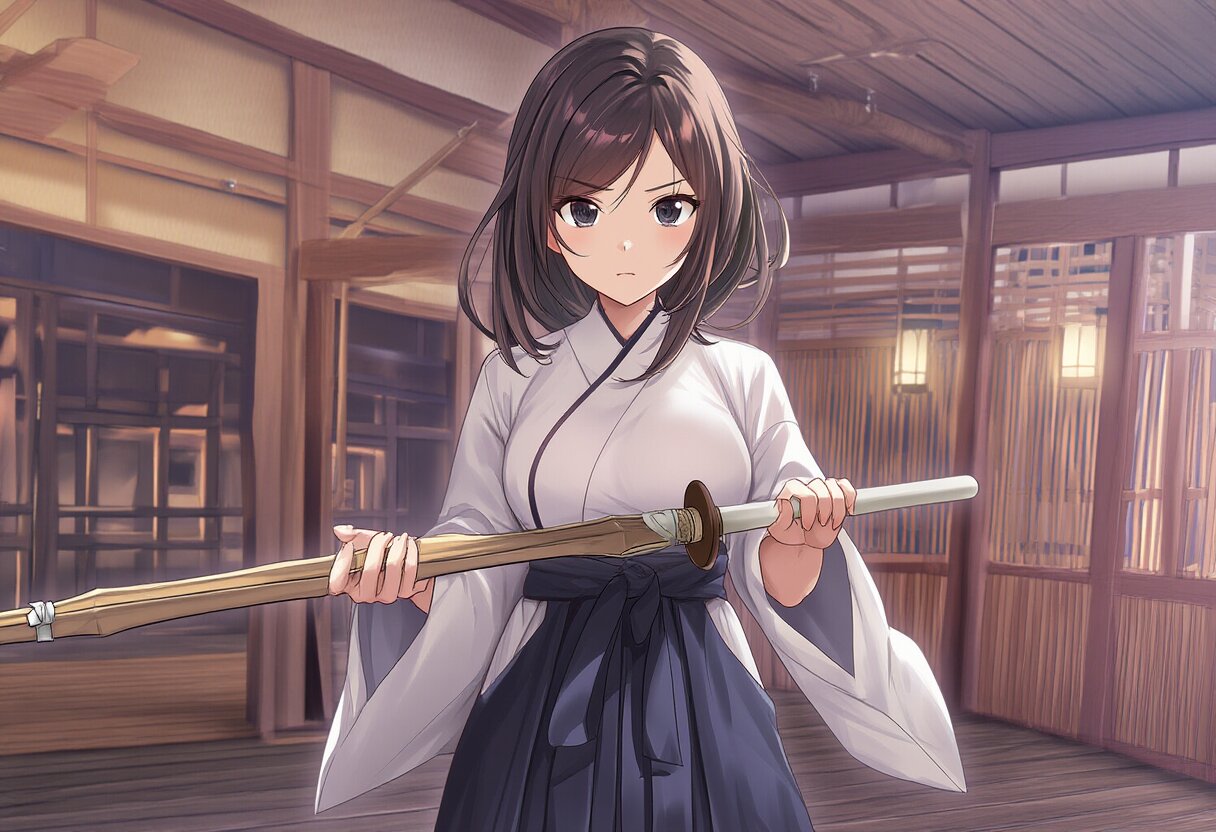 {{{highly detailed}}}, {{official style}}, {{game cg}}, {{tenka hyakken}}, 1girl, solo, medium hair, dark brown hair, swept bangs, black eyes, large breasts, serious, white kimono, blue hakama, holding shinai, cowboy shot, indoor, no humans, {{{masterpiece}}}, {{{best quality}}}, {{{very aesthetic}}}, {{{ultra-detailed}}}, {illustration}, {{{extremely detailed}}}, {{{an extremely delicate and beautiful}}}