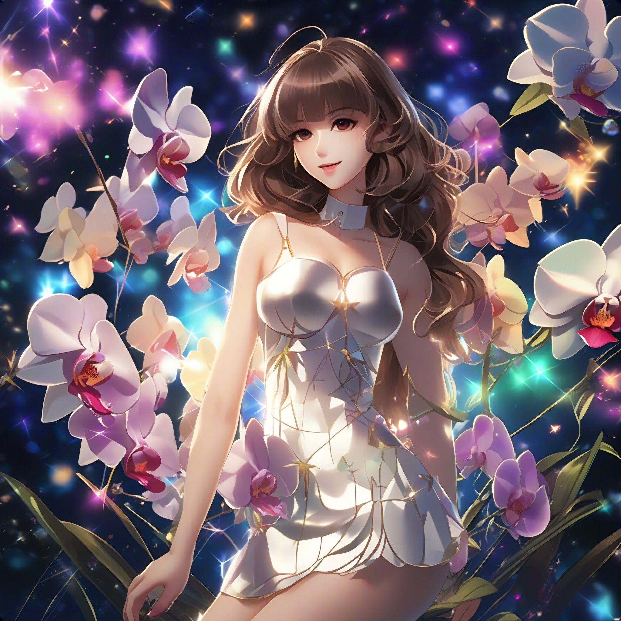 masterpiece, best quality, animation style,anime colored, middle breasts, in heat,forest, (Phalaenopsis orchid:2.0), halo, magic particles, light particles, several colored stars, in the midnight, 1 lady, brown hair, bob cut, white mini dress, mini skirt, look at viewer, lavender, (kaleidoscope:2.0), magic particles, light particles, rainbow gradation