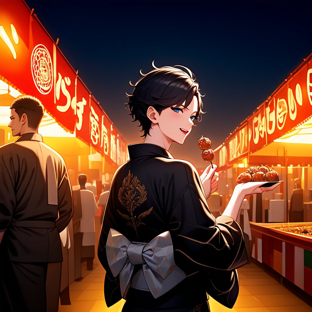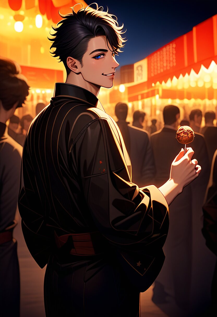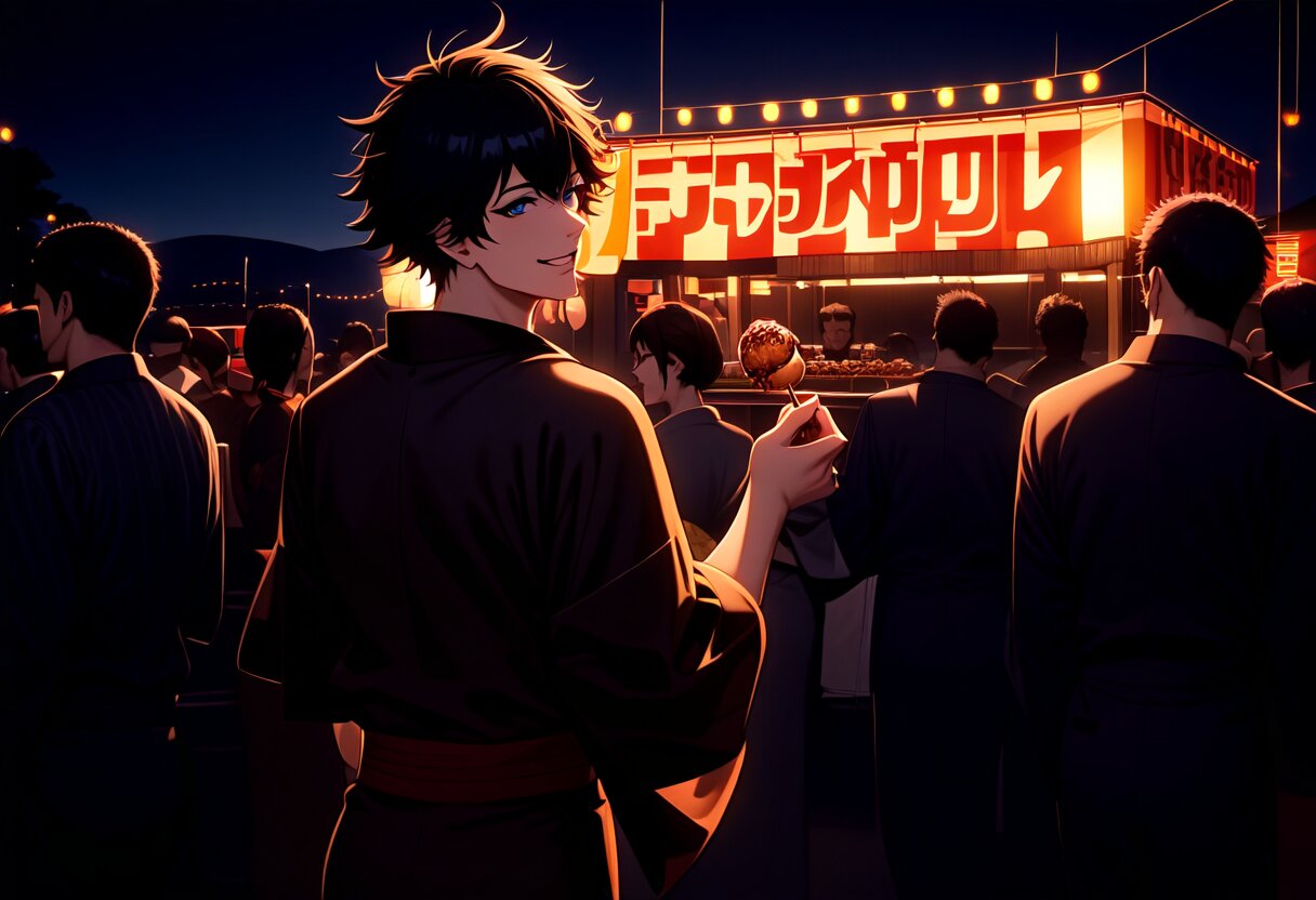 {{{masterpiece}}}, {{{best quality}}}, {{{very aesthetic}}}, {{{ultra-detailed}}}, {illustration}, {{{extremely detailed}}}, {{{an extremely delicate and beautiful}}}, {{{highly detailed}}}, {{official style}}, {{game cg}}, style of ai-generated, {{goddess of victory: nikke}}, {{male focus}}, {{adult man}}, {{25 year old male}}, 1boy, solo, blue eyes, {{spiked hair}}, {{{{{{{{{{very short hair}}}}}}}}}}, light black hair, swept bangs, flat chest, walking, looking back, cowboy shot, happy, {{{dark brown kimono}}}, {{{{{eat takoyaki}}}}, smile, night, festival, food stand, multiple boys, crowd, multiple girls
