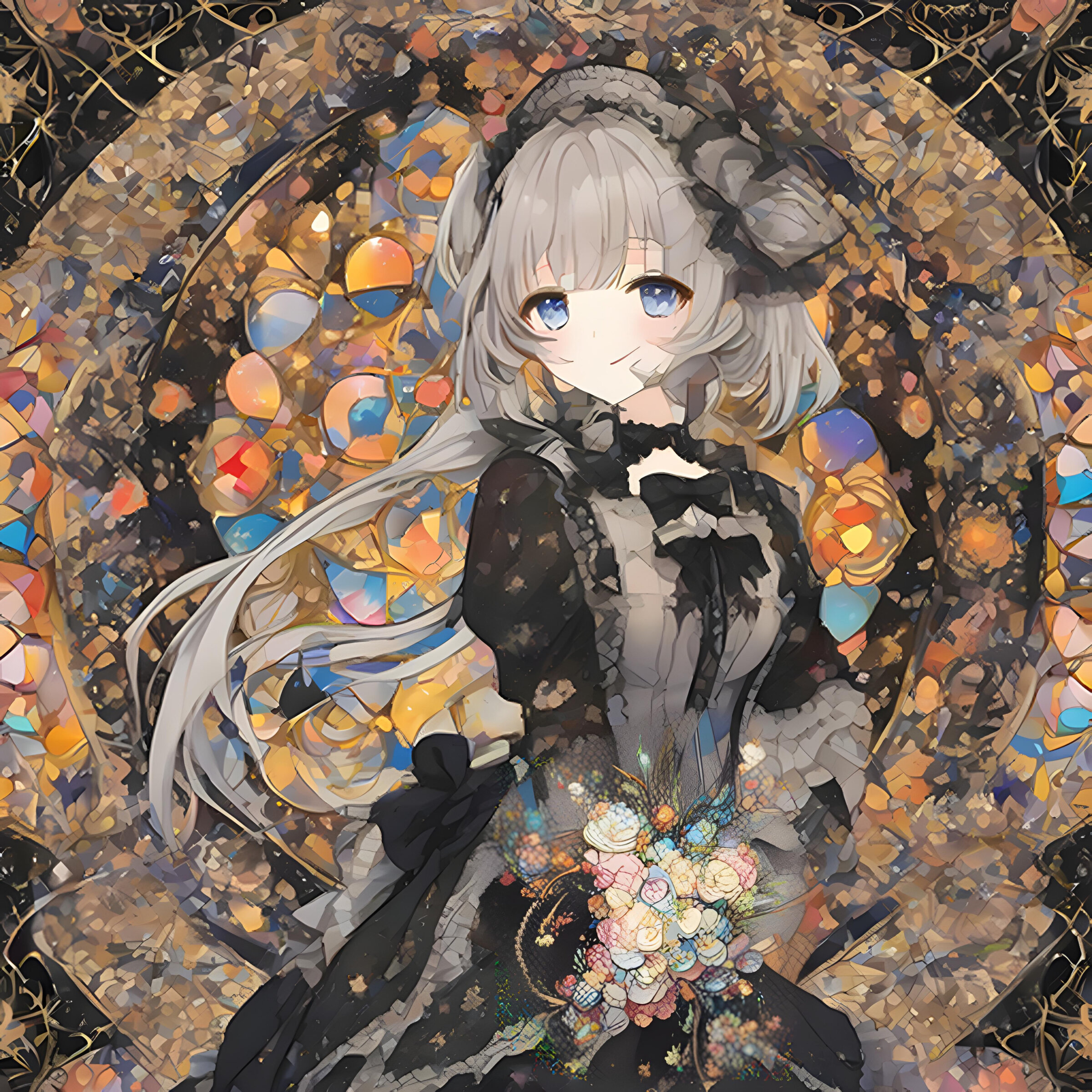masterpiece, best quality, animation style, anime colored, lapis lazuli, vibrant colors, decadent, (crow:1girl:0.1), (The background is kaleidoscope style:2.0), smile, middle breasts, moon, Emerald, midnight, in church, (stained glass in the background:0.2), golden stars, buried in colorful stars, black Gothic and Lolita clothes