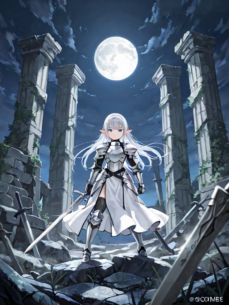 masterpiece, best quality, high resolution, BREAK, 1 girl ,looking at the viewer, from front, cute, kawaii, elf, blue eyes, silver straight hair, long hair, BREAK, standing, silver armored dress, wide shot, fighting stance, holding sword, ancient ruins,night, moon, <lora:Dreamyvibes artstyle SDXL - Trigger with dreamyvibes artstyle:1>