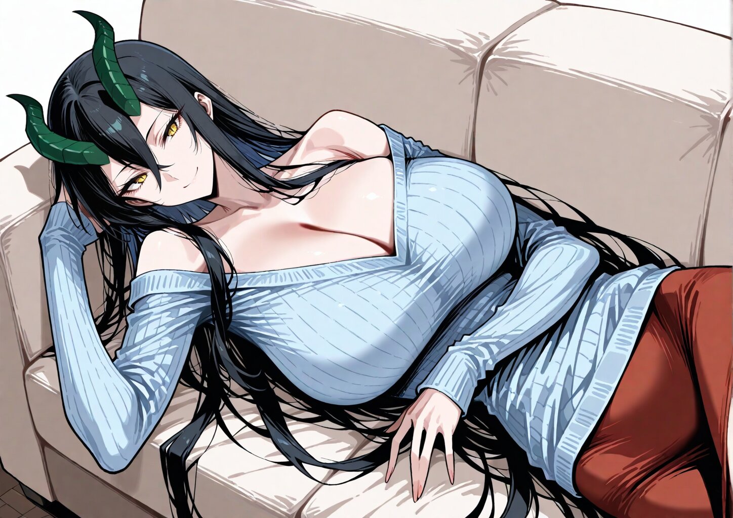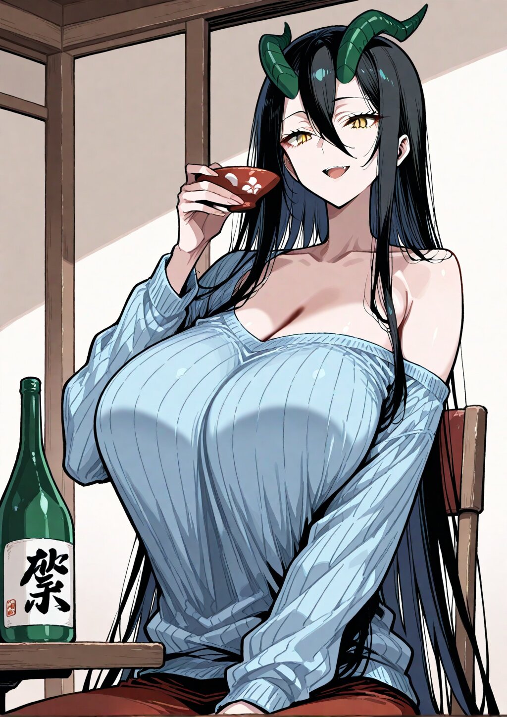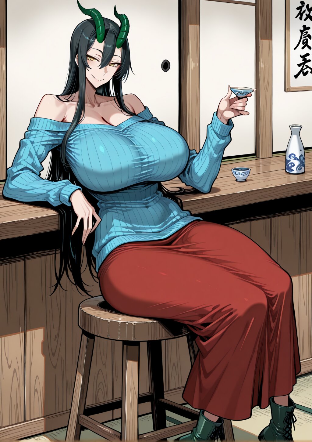 <lora:tsutsuji:1>, (tall:1.5) female, skinny, large breasts, Tsutsuji_OC, black hair, long hair, straight hair, hair between eyes, sidelocks, green dragon horns, horns facing backward, horns on forehead, yellow eyes, slit pupils, neon blue sweater, off shoulder, red long skirt, dark green boots, izakaya, sitting wooden stool, drinking choko \(cup\), naughty face, upper body,
