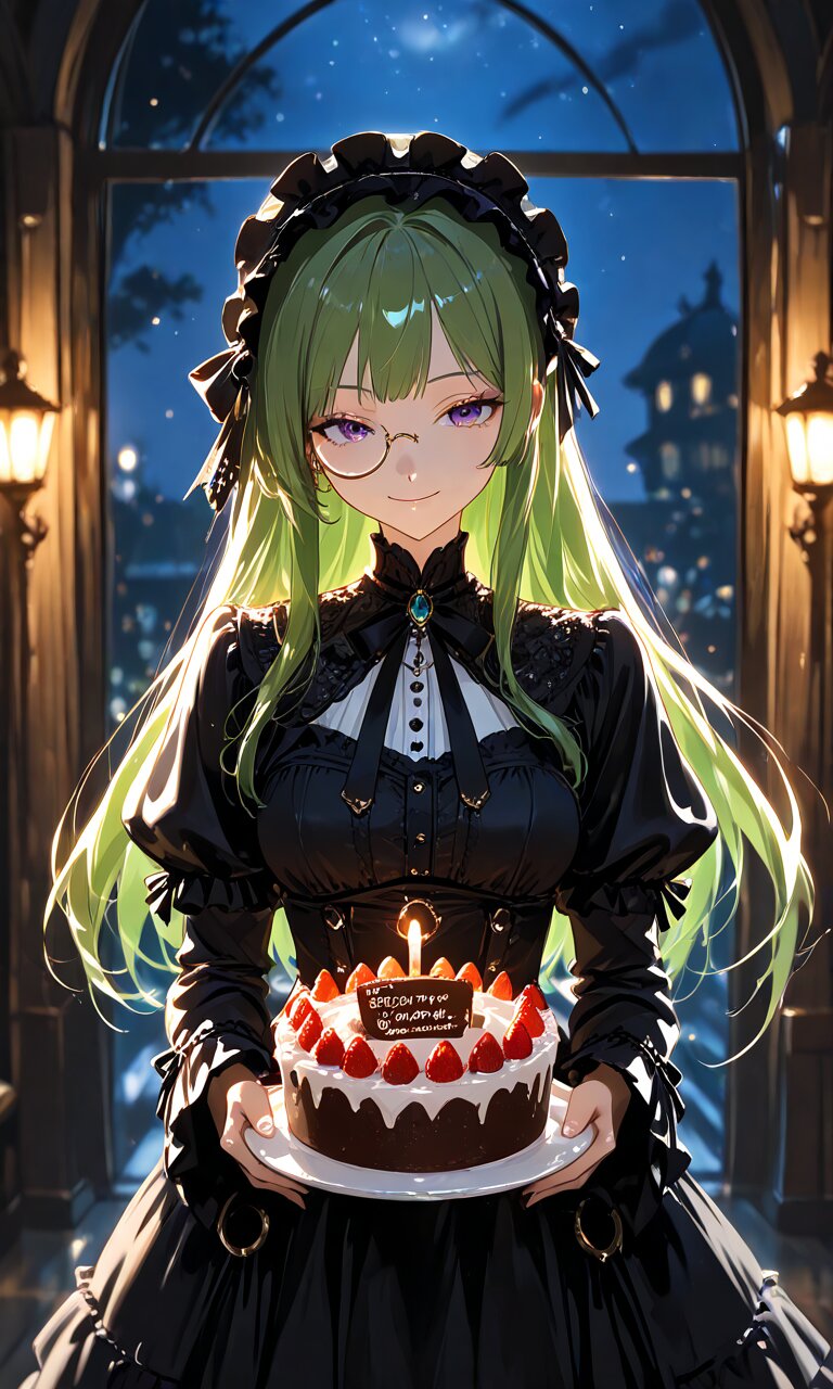 1 lady, long hair, green hair,((monocle)), (gothic lolita, black cloth),, ,seductive smile, cowboy shot, night,standing, (holding cake),