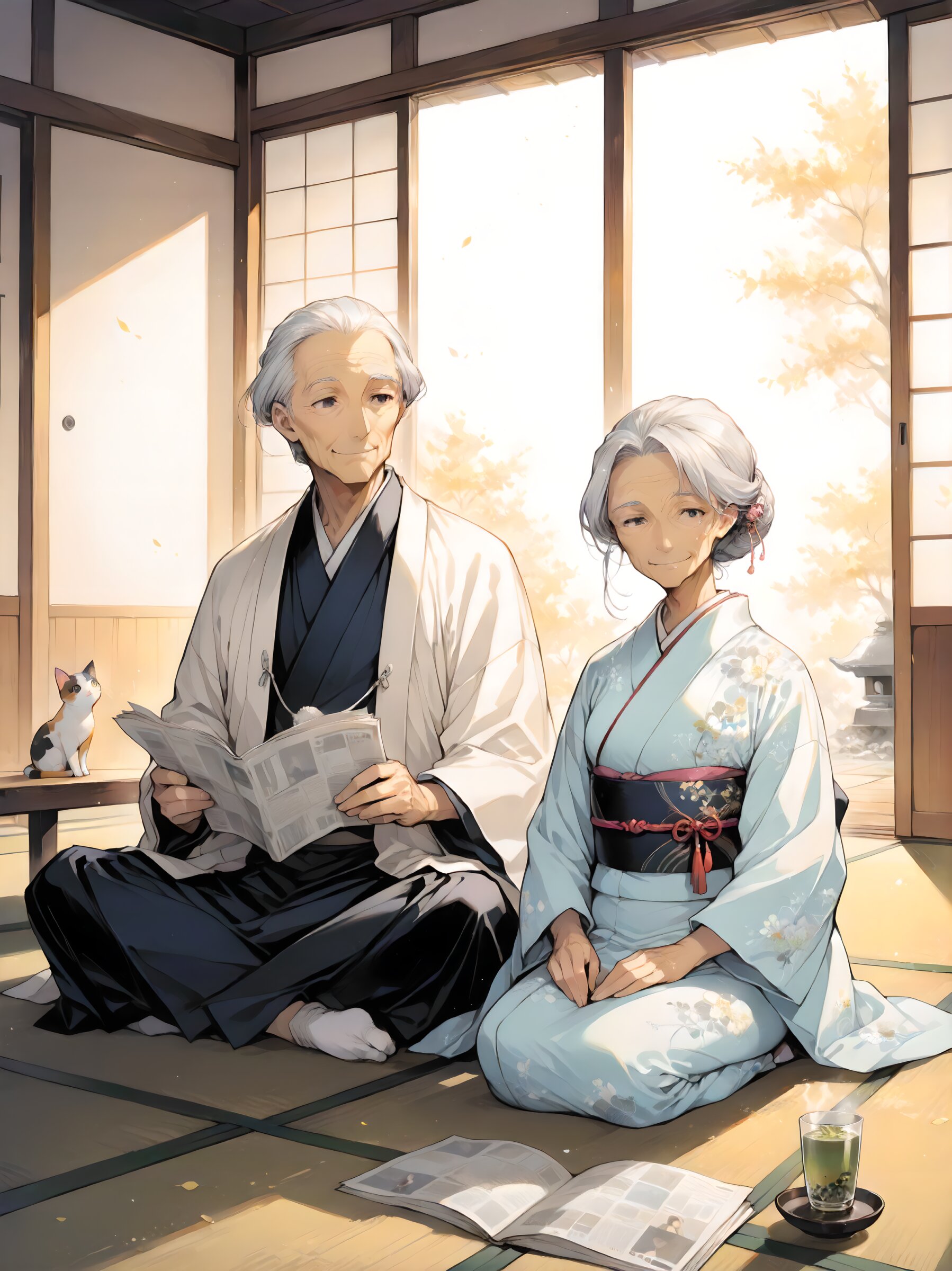 Best quality, Masterpieces, simple background, lots of negative space, delicate anime-style illustration, white background, fine detail, 1boy and 1girl, face to face, sitting, drink green tea, BREAK 1boy and 1girl, (male focus), (old man), silver elegant hairstyle, well-groomed short hair, wrinkles, eyes that convey a wealth of experience and knowledge, gentleman, samue, indian style, reading newspaper, BREAK 1boy and 1girl, (old woman:1.2), (aged up), (slender), (wrinkled skin:1.2), (gentle nature), black eyes, white hair, medium hair, hair bun, kimono, seiza, smile politely, BREAK content, cozy composition, wooden counter, welcoming atmosphere, traditional japanese room, tatami, a calico cat